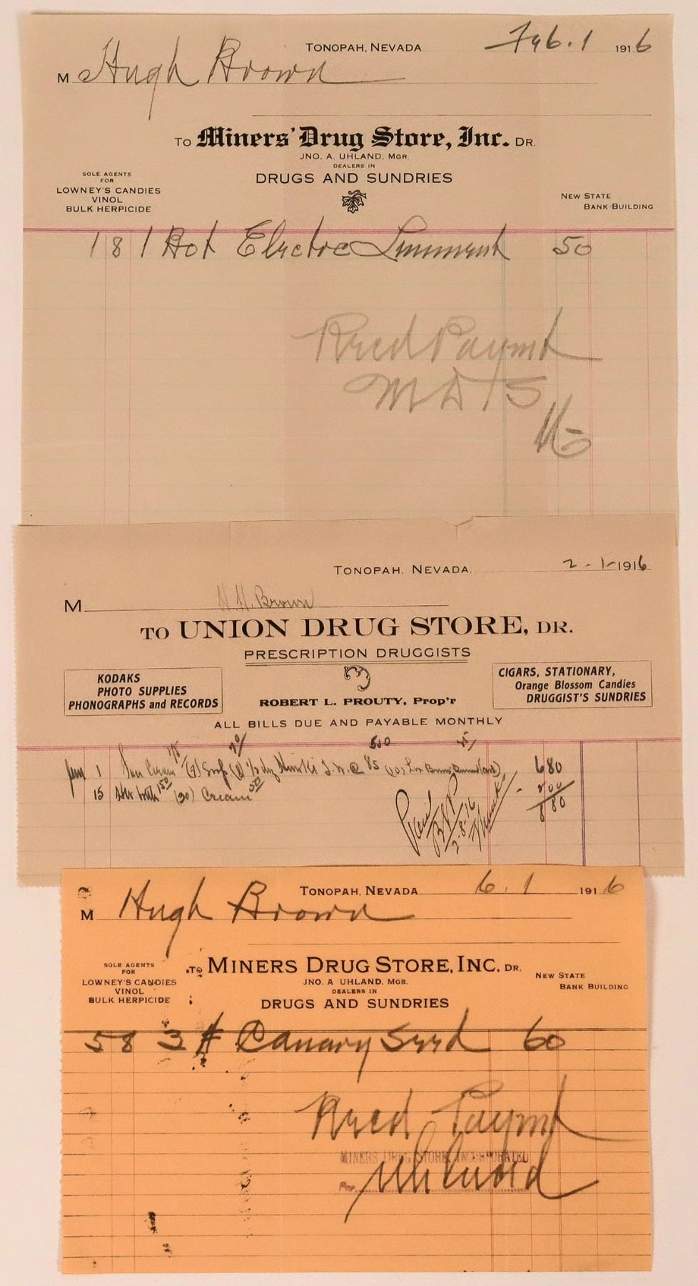 Lot of 3. 1) Two different for the Miners' Drug Store, Inc. Jno. A. Uhland, Manager. Dealers in Drugs and Sundries. Sole Agents for Lowney's Candies, Vinol, Bulk Herpicide. New State Bank Building. Both billed to High Brown in 1916. One orange. Folds. 2) Union Drug Store billhead. Robert L. Prouty, Proprietor. Prescription Druggists. Kodaks, Photo Supplies, Phonographs and Records, Cigars, Stationary, Orange Blossom Candies, Druggist's Sundries. Billed to HH brown in 1916. Folds, a few tears.
