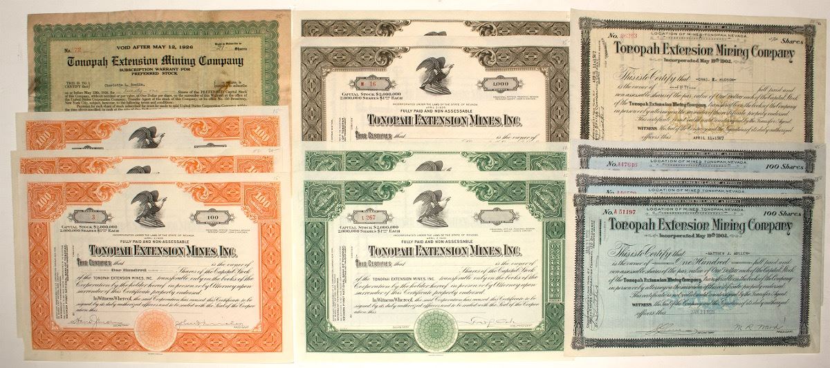Lot of 12. One black issued 1927, 2 blue issued 1925 and 1926, and 1 light green issued 1928. Three signed, but not issued certificates: Orange #2 for 100 shares, orange #3 for 100 shares, and black #M16 for 1000 shares. Four unissued certificates: two green L267 and L269, orange #70, and black number M3. Tonopah Extension subscription warrant for preferred stock. Number 72 for 21 shares. (Prag collection) City: Tonopah State: Nevada Date: c1920 ID# 28045