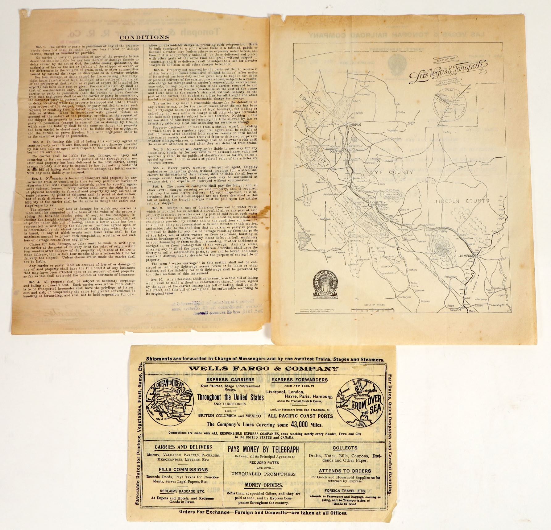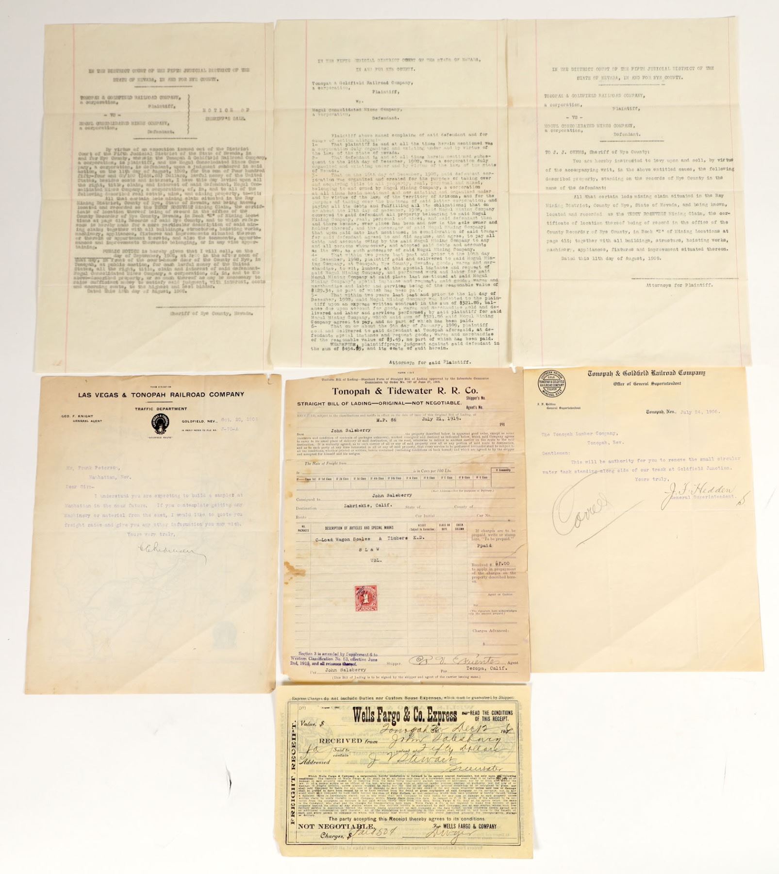 Lot of 8. Rare group! Includes: Tonopah & Goldfield Railroad delivery receipt (1928); Tonopah & Tidewater RR Bill of Lading (1915 to Zabriskie, CA); Tonopah & Goldfield RR letterhead (1906); Las Vegas & Tonopah RR Co. letterhead (1908); three Tonopah & Goldfield RR legal docs related to case against the Mogul Mines Co.; and a Wells Fargo Tonopah receipt (1906).