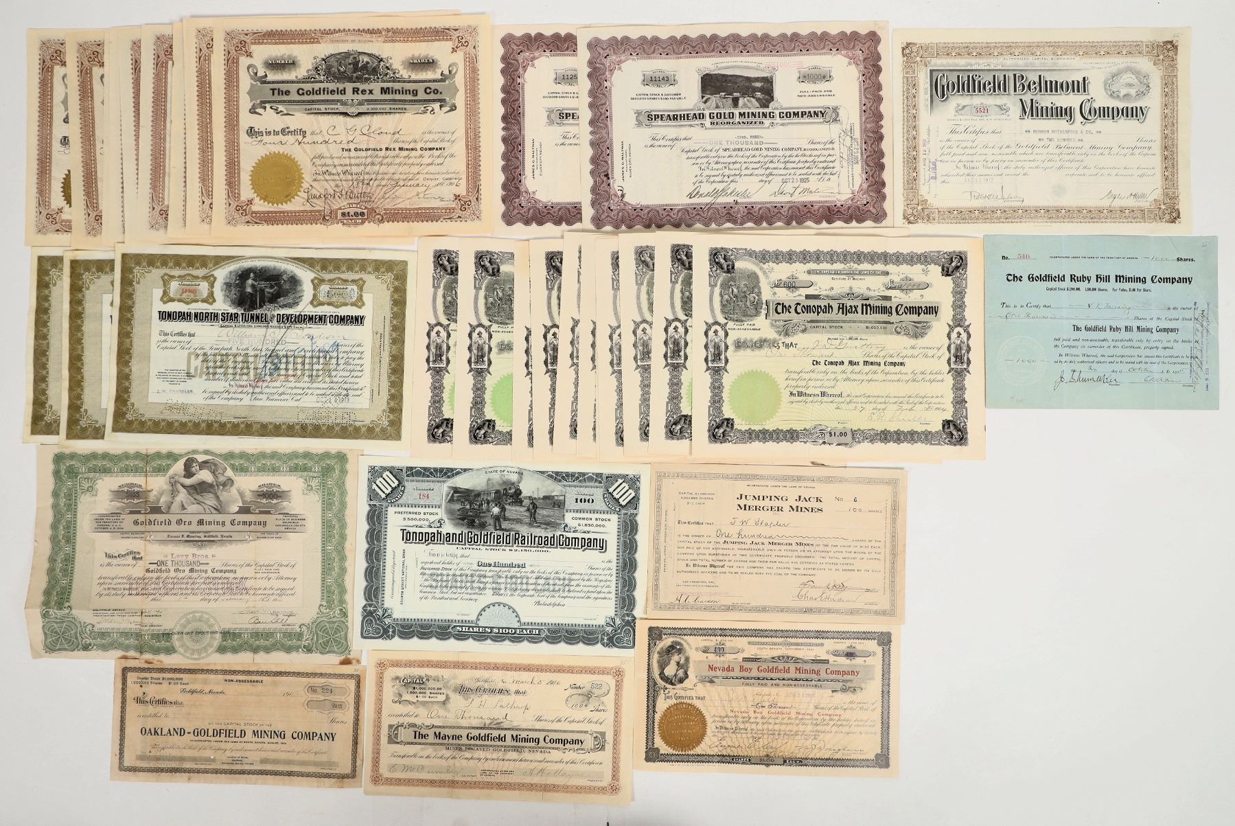 Group of 35 stock certificates from 12 different Nevada mining companies operating in Goldfield and Tonopah, issued from 1904 to 1925. All but one issued, 5 cancelled. Lot includes 1 cert each from Oakland-Goldfield Mining Co., Goldfield Ruby Hill Mining Co., Goldfield Belmont Mining Co., Tonopah & Goldfield Railroad Co., Jumping Jack Merger Mines Inc., Mayne Goldfield Mining Co., Nevada Boy Goldfield Mining Co., and Goldfield Oro Mining Company. Also includes stocks from Tonopah North Star Tunnel & Development Co. (3), Spearhead Gold Mining Co. (2), Goldfield Rex Mining Co. (9), and Tonopah Ajax Mining Company (13). Some nice mining vignettes, including one uncommon photographic vignette. Pieces significantly vary in size and condition; see photo for details.