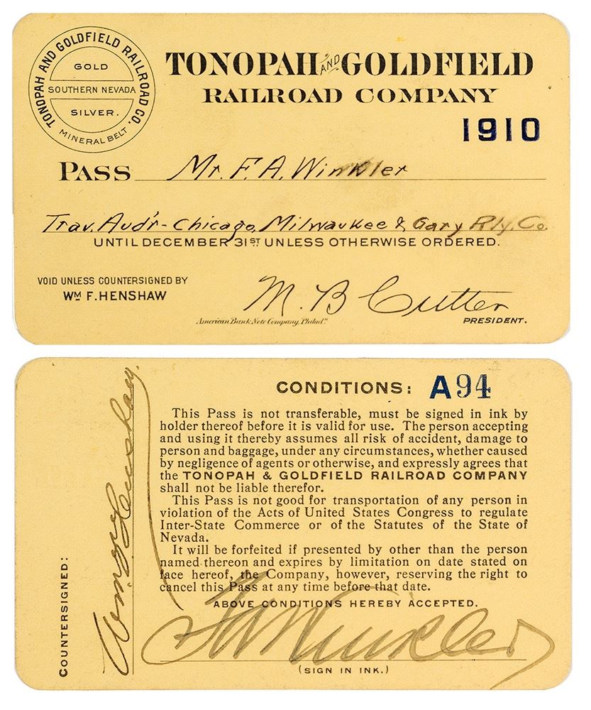 No. A94, issued in 1910 to F.A. Winkler (Chicago, Milwaukee & Gary Railway Co.). Printed signature of M.B. Cutter as president and countersigned on reverse by Wm. F. Henshaw. Printed on yellow cardstock by American Bank Note Co., Philadelphia. Advertises Southern Nevada Gold & Silver Mineral Belt in the logo. Very good condition. (Prag Collection) City: Tonopah State: Nevada, Date: Inventory# 39074