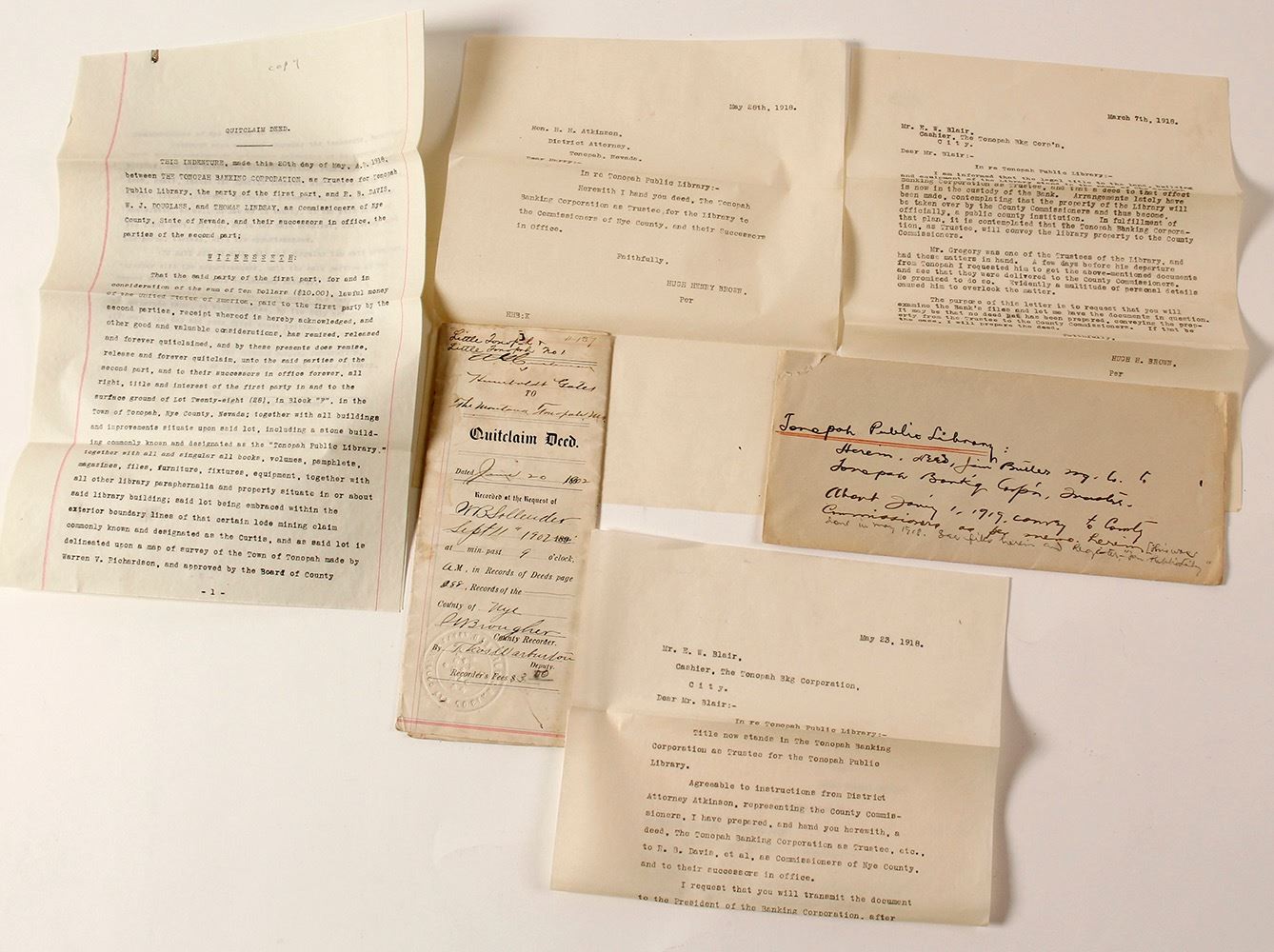 Letter from from the Cashier of the Tonopah Banking Corp., a Quitclaim Deed, a letter from Hugh Henry Brown to Hon. H.H. Atkinson, District Attorney of Tonopah, Nevada. Date: 1918 Location: Tonopah, Nevada HWAC# 57501