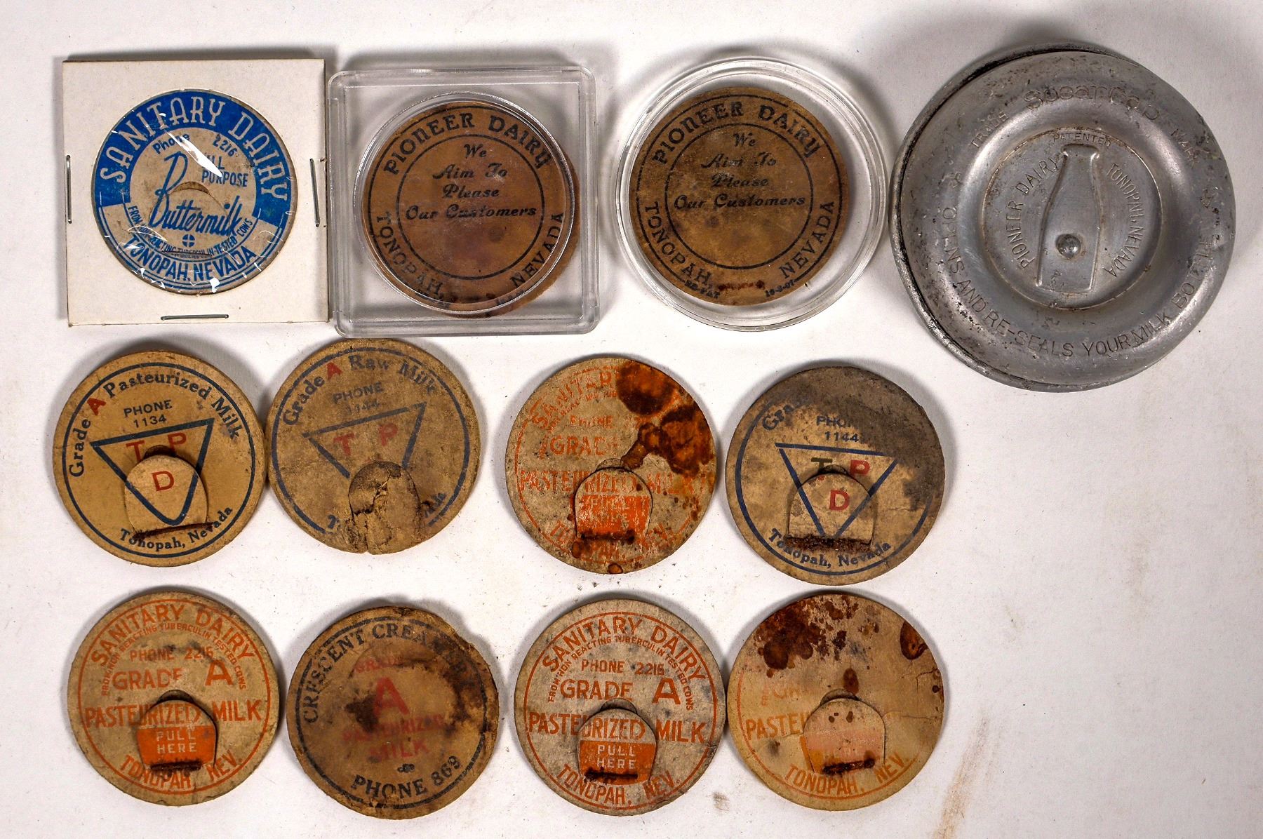 Group of 12 bottle tops from dairies in Tonopah, Nevada. Lot includes 11 dense paper/cardboard tops with company names and mottos and 1 extremely rare tin top, the first we've ever seen. Tops vary in condition; see photos.