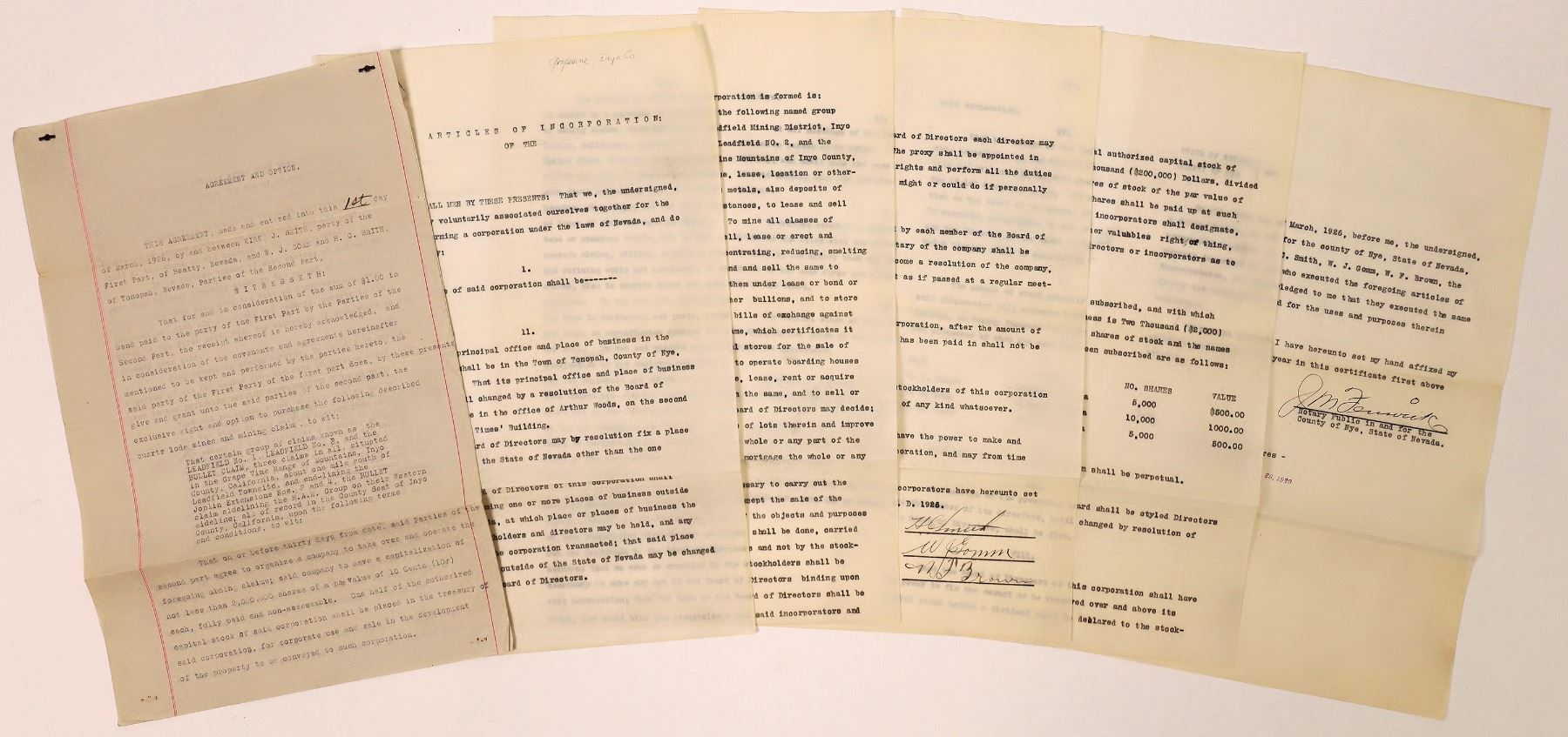 Agreement papers drawn up between Kirk Smith & W.J. Gomm. It concerns a mining operation in Nye County, Nevada. This six page document has all the whereas and heretofores of many legal docs of the past and present. It is typed on onion skin paper and in good shape. Please see photos for more detail and condition.