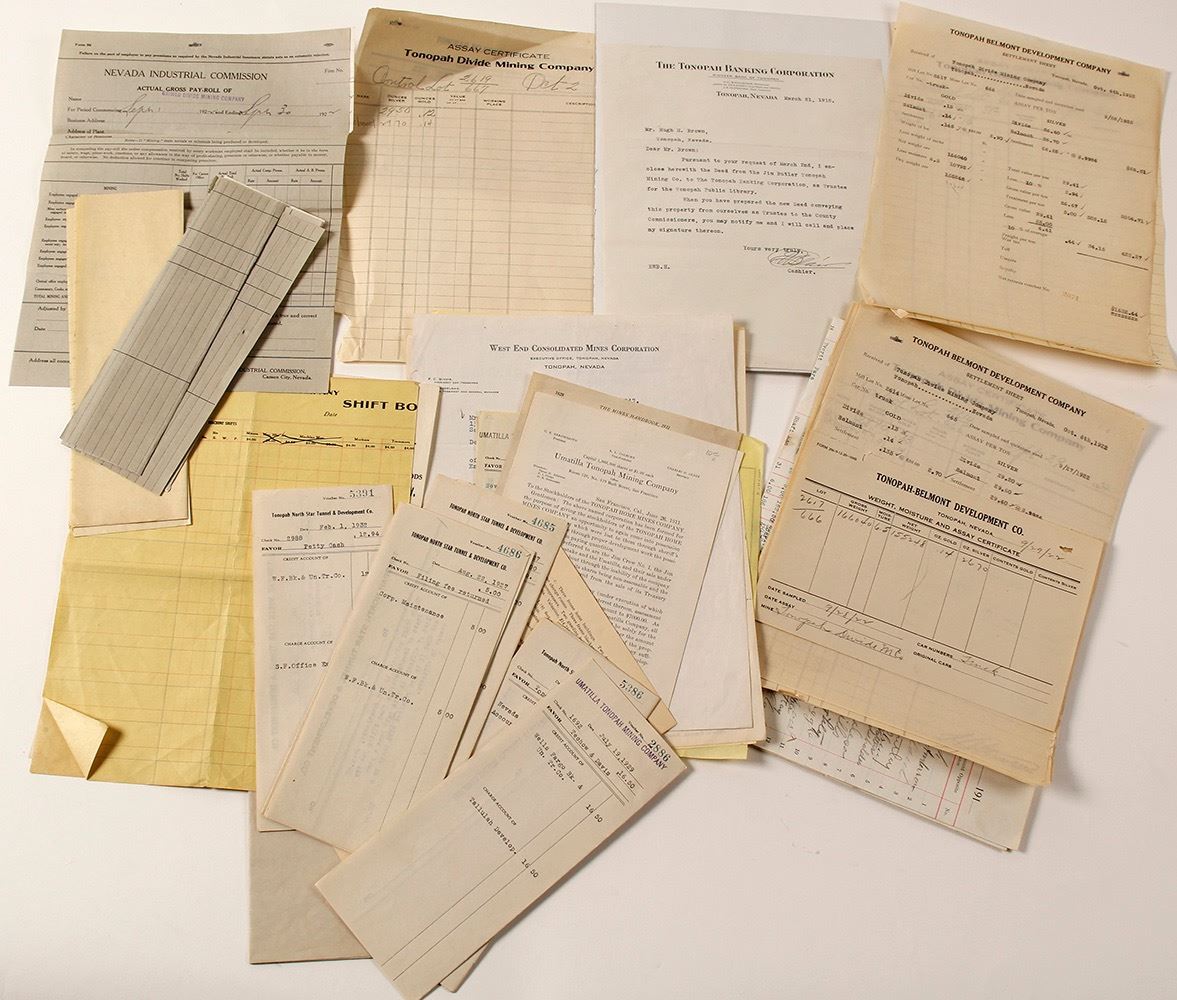 This collection of approx. 25 pieces of misc. letters, Annual Reports, Quitclaim Deeds, billheads from West End Consolidated Mining Co.; Jim Butler Tonopah Mining Co., and many more. Some condition issues of staining and wear. All legible. Date: early 1900's Location: Tonopah, Nevada HWAC# 57506