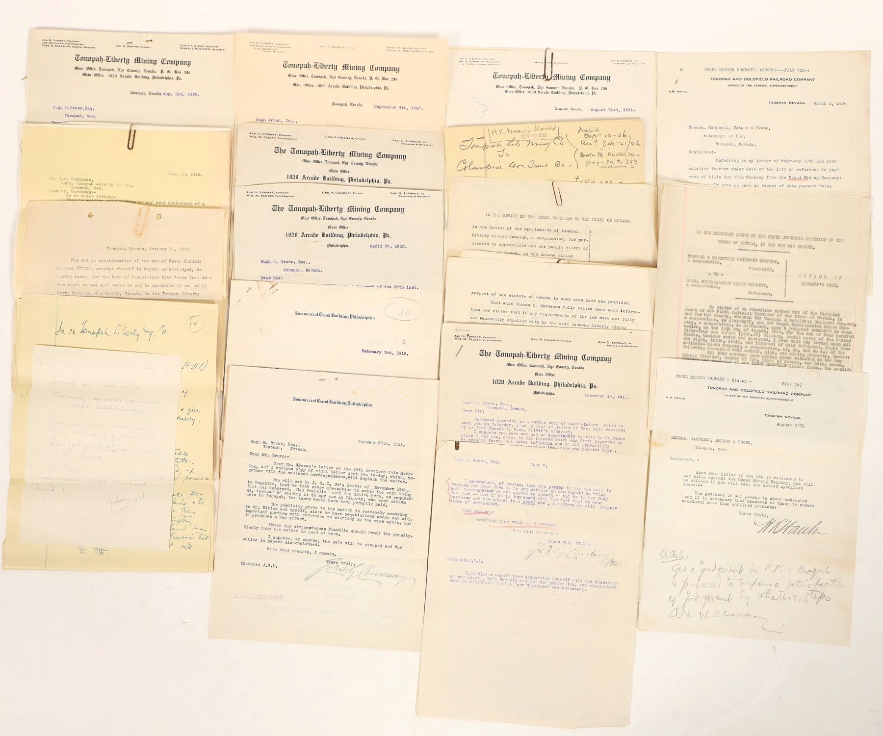 A collection of correspondence and ephemera related to the mining industry in Tonopah, Nevada, dating from 1900 to 1920. The collection contains financial and legal correspondence from the Tonopah-Liberty Mining Company as well as the Tonopah Mogul Mining Company. Numerous letters sent between Tonopah-Liberty and Southern Nevada-area lawyers bear the letterhead of the company and are written and signed by Jason G. Lindsay and Thomas S. Carnahan, respectively the President and General Manager of the company. Collection contains approximately 40 items, all of which are in good condition.