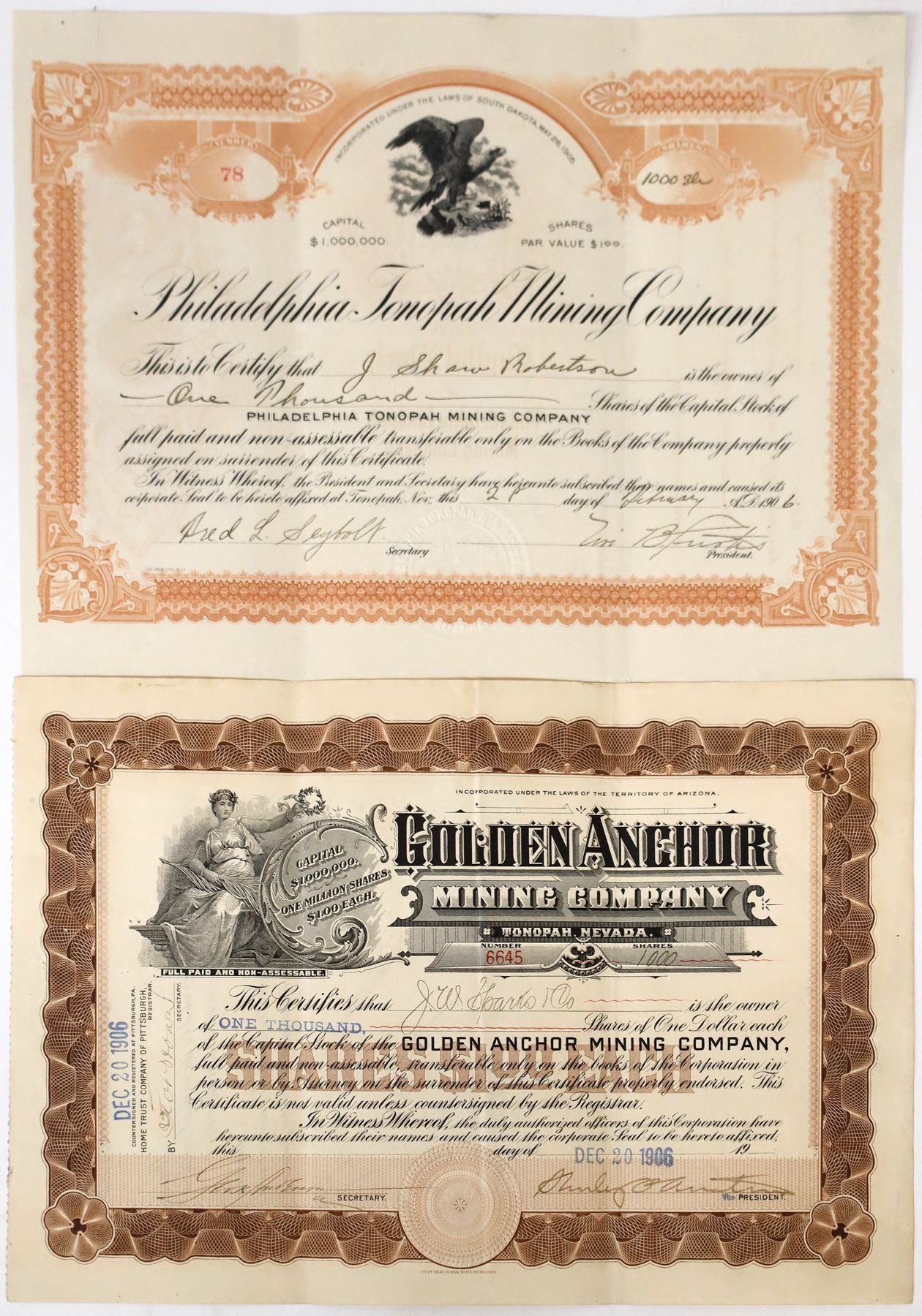 1) Halifax Tonopah. 1822. Signed by resident F. M. Smith. Francis Marion Smith as known as the 'Borax King' 2) Golden Anchor. 1906. Issued to the J. W. Sparks Company. Sparks was Governor of Nevada at this time. 3) Philadelphia Tonopah. Located in the same area as the Golden Anchor. 4) Manhattan Tonopah. 1905. When the Tonopah Bonanza received an inquiry about this company they replied that this mine is unknown to local residents. 5) Nevada Gold Mountain. 1907. Divide District. No information found on this company. Includes notes on the companies and people.