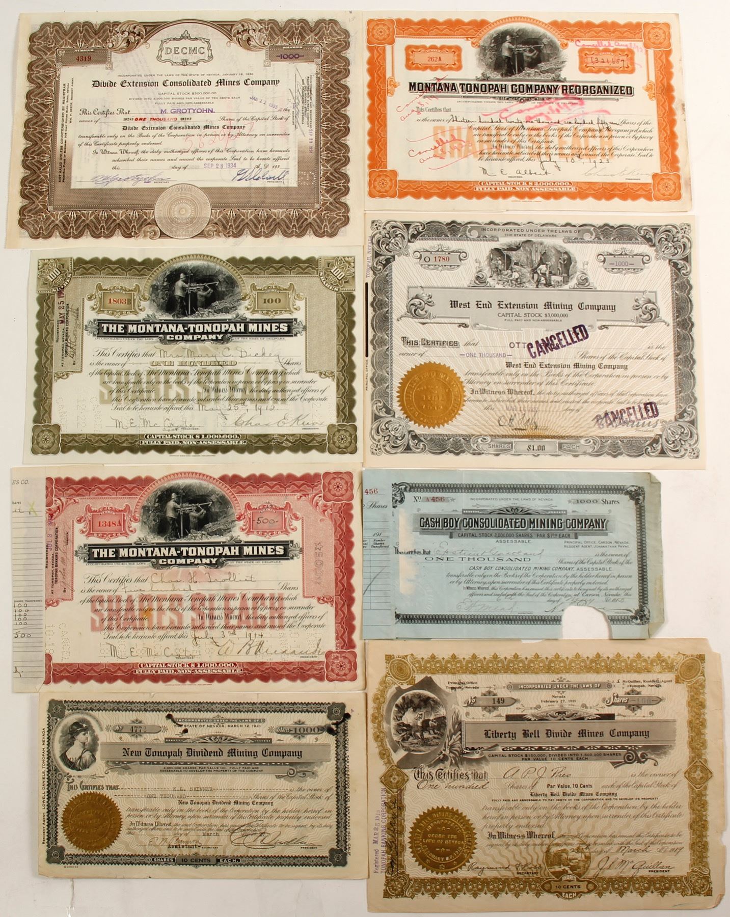Five cancelled Tonopah stocks: three The Montana-Tonopah Mines Co., 1912, 1914 and 1923; West End Extension Mining Co., 1927; Divide Extension Consolidated Mines Co., 1934; also included--uncancelled: Cash Boy Consolidated Mining Co, 1915; New Tonopah Dividend Mining Co., 1927; Liberty Bell Mines Co., 1919.