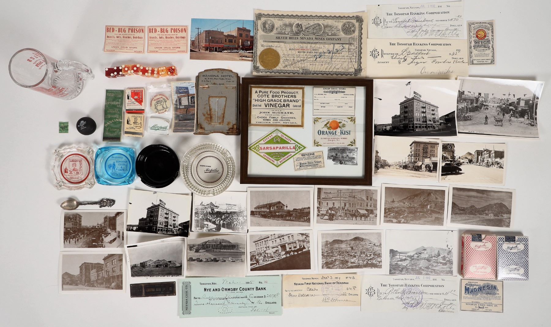 Large and diverse group of Tonopah collectibles! 50+ items. Includes: sterling silver spoon, 10 gaming dice (Mizpah Hotel, Tonopah Club, and Town Hall Club), four ashtrays, two Mizpah decks of cards, drug and bottle related labels, checks, historical photo reprints, postcards incl. RPPC, matchbooks, a beer glass, and more. Instant collection! Please inspect.