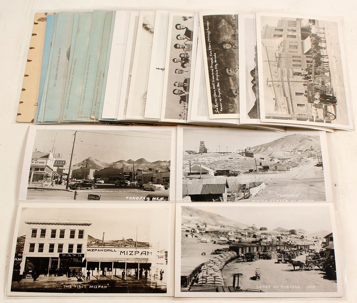 Lot of twenty-three. Some nice and unusual reprints of the early days of Goldfield: the original Mizpah, July 4 1913, crowded street, different depot view, entire 1902 population, overviewsmining, Jim Butler, freight team, etc. Fourteen black & white, Black & white reprints, and RPCs. HWAC# 62233 Date: Location: Tonopah, Nevada