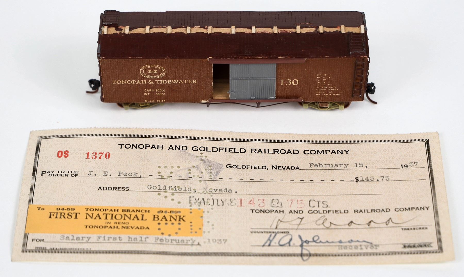 Tonopah Railroad themed lot, includes two photo cards showing scenes from the railroad, a check, and an HO gauge scale model of a boxcar marked Tonopah & Tidewater. The car has been distressed. All are in nice condition.