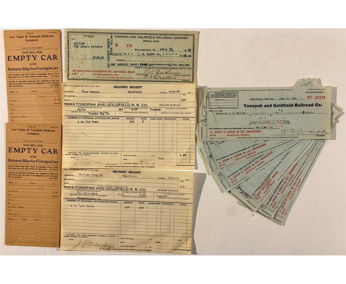 Lot of 11. Includes: six payroll checks for the Tonopah and Goldfield Railroad Co. (with Goldfield dateline), 1931-36; two delivery receipts for the same railroad for items shipped to Sacramento and San Francisco, 1928; a special fund check from 1929; and two unused Slip Bills for Empty Car and Return Slip for Foreign Car, Las Vegas & Tonopah Railroad, c.1907. (8" x 3.5"). (Prag Collection)