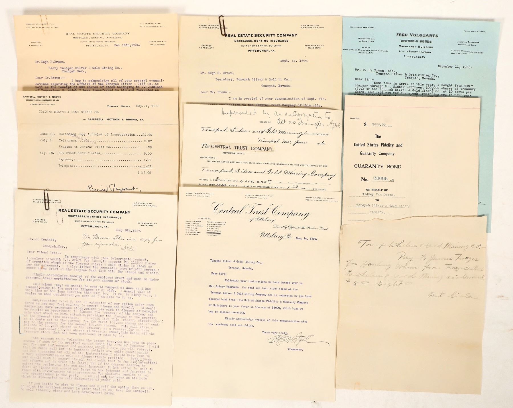 A collection of correspondence and ephemera related to the Tonopah Silver & Gold Mining Company, dating from 1906 to 1907. Approximately 12 items. The correspondence includes letters from several companies addressed to Tonopah Silver & Gold discussing financial matters, including the sale and transfer of stocks and bonds. Majority of letters are typewritten. Collection is legible and in good condition.