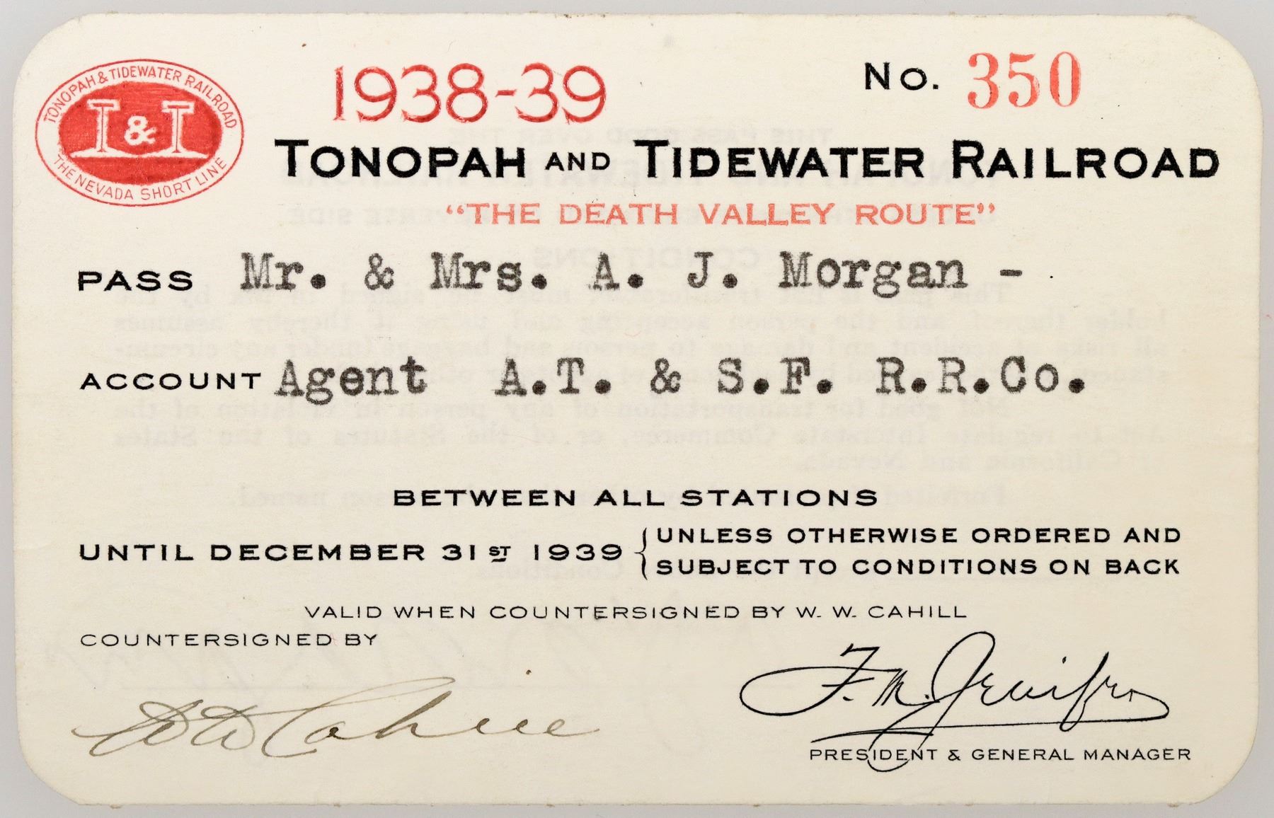 Pass no. 350, issued for 1938-39 to AJ Morgan, AT&SF RR. Preprinted signature of the vice president. Countersigned by Cahill. Signed by Morgan on reverse. The "Nevada Short Line" operated between Ludlow, California and Beatty/Tonopah/Goldfield, Nevada. It was originally conceived of by "Borax" Smith as a way to transport borax from his mines to the market. From 1908-1914 (and after 1918), the Bullfrog Goldfield Railroad was combined with the T&T. The line operated until 1940.
