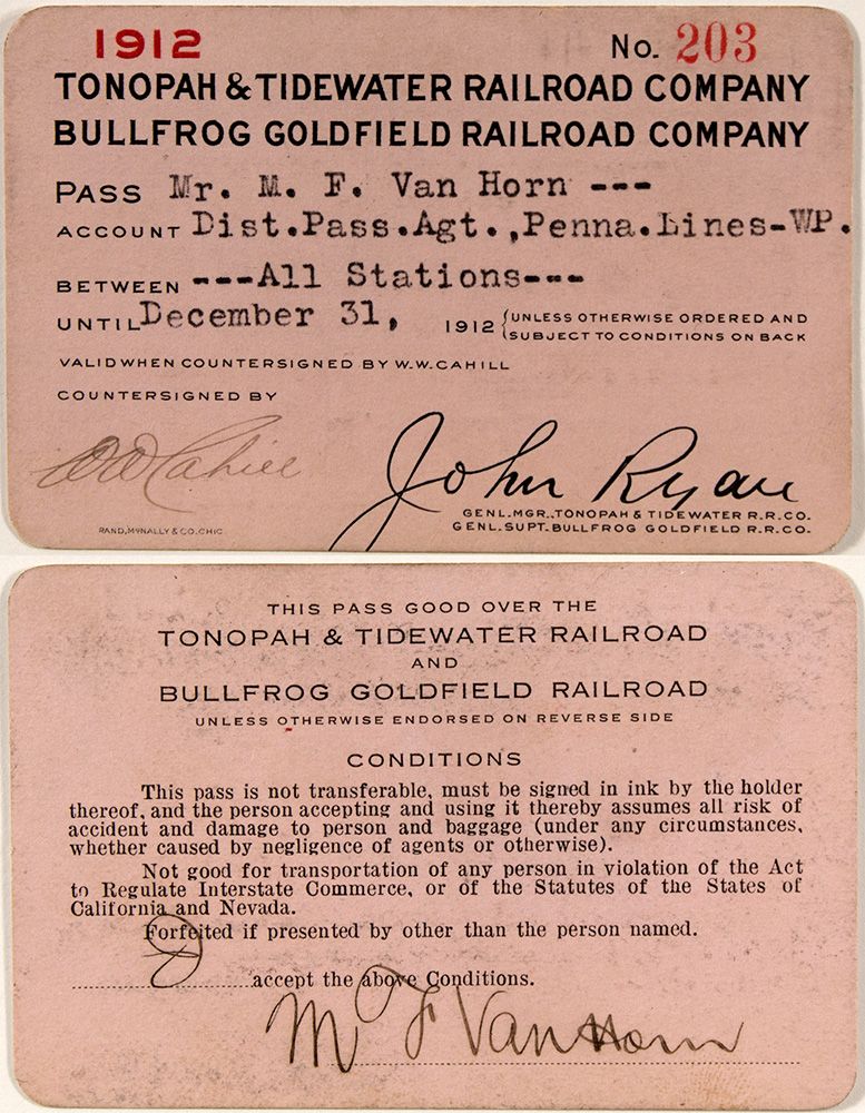 Pass no. 203 issued to Mr. M. F. Van Horn, district passenger agent for the Pennsylvania lines West of Pittsburgh. The pass was good for the 1912 year. The pass has little wear and marks.City: TonopahCounty: State: NVDate: