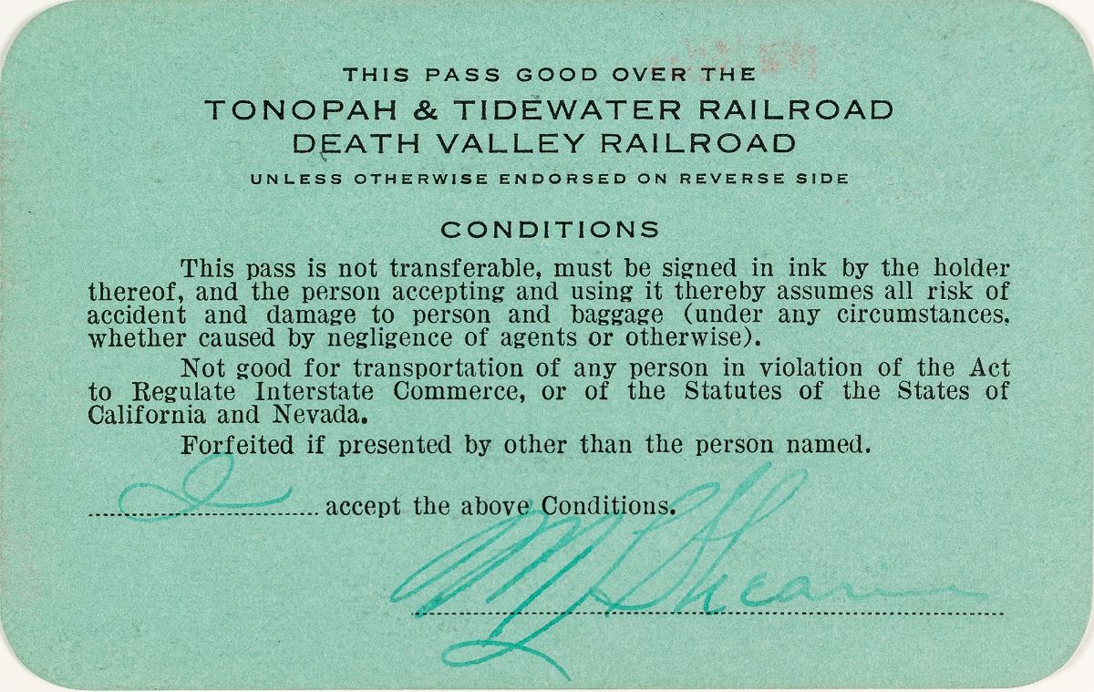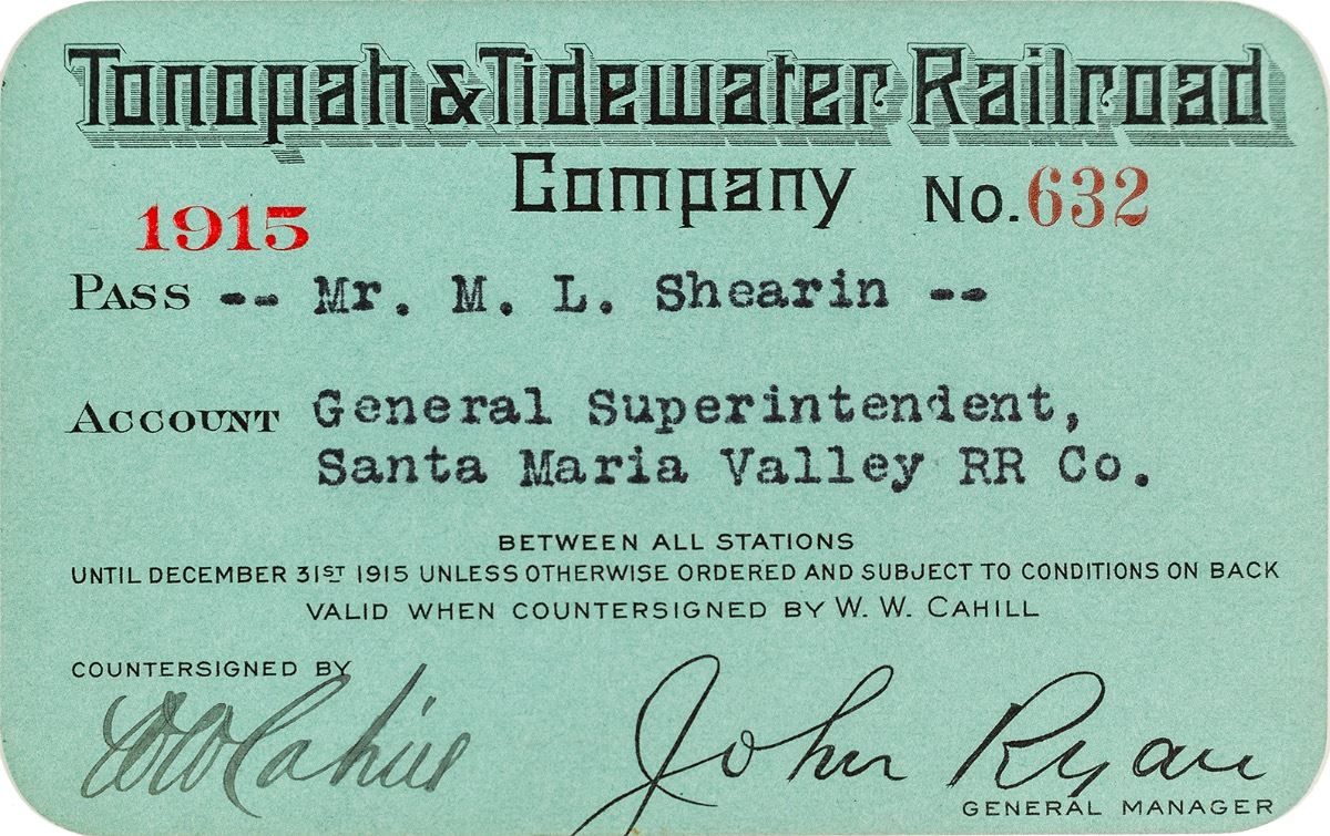 Rare. No. 632, issued in 1915 to M.L. Shearin (gen. supt. of Santa Maria Valley RR Co.). John Ryan as general manager, countersigned by W.W. Cahill. Printed on blue/green cardstock. Clean. (Prag Collection) City: Tonopah State: Nevada, Date: Inventory# 39067