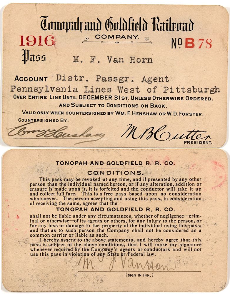 B78 issued to Mr. M. F. Van Horn, district passenger agent for the lines West of Pittsburgh. The pass was good for 1916 year. There is some wear on the pass including small marks.City: TonopahCounty: State: NVDate: