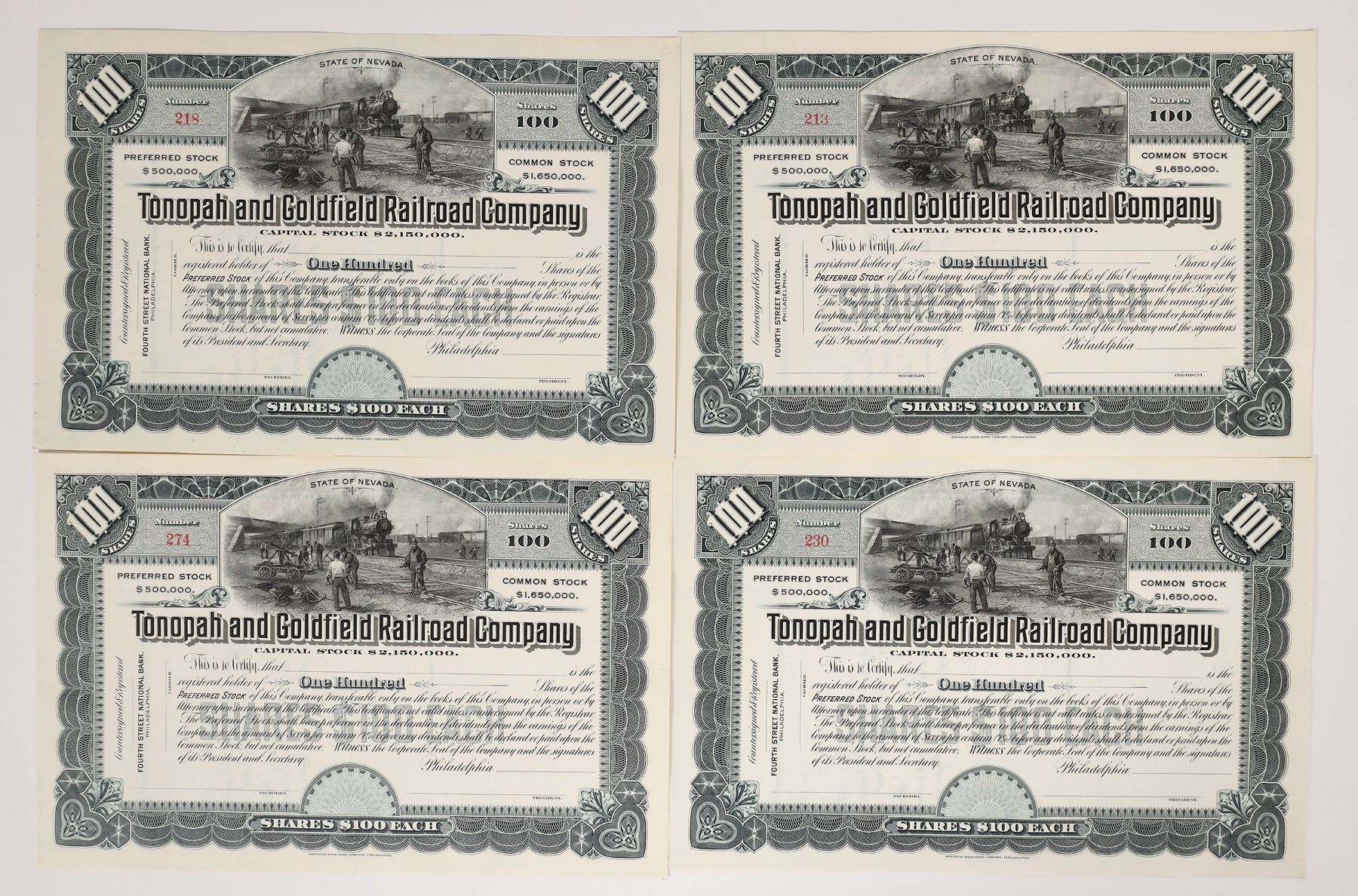 4 unissued 100 shares each of Tonopah and Goldfield Railroad Company stock, certificates, 213, 218, 230 and 274. Nice vignette of train pulling into railroad with workers present. Gray ink. Excellent condition. Tonopah and Goldfield Railroad, covered 100 miles in NV, providing service between Mina and Goldfield, running over the Excelsior Mountains and parallel to the Monte Cristo Range operated from 1905 until 1947. A prior railroad, Tonopah Railroad, started operating in 1903. Railroad building increased with the discovery of minerals: silver discovered in Tonopah in 1900, gold in Goldfield in 1902, silver at Silver Peak. Only stage coaches were running at that time. The Tonopah Railroad built 1903-1904 ran from Sodaville Junction to Tonopah. The Tonopah and Goldfield Railroad merged with the Goldfield Railroad. A spur line merged with Goldfield Railroad in November, 1905 to create the Tonopah and Goldfield Railroad. It continued to do business until it disbanded in 1947. Printed: American Bank Note Company, Philadelphia. Nevada