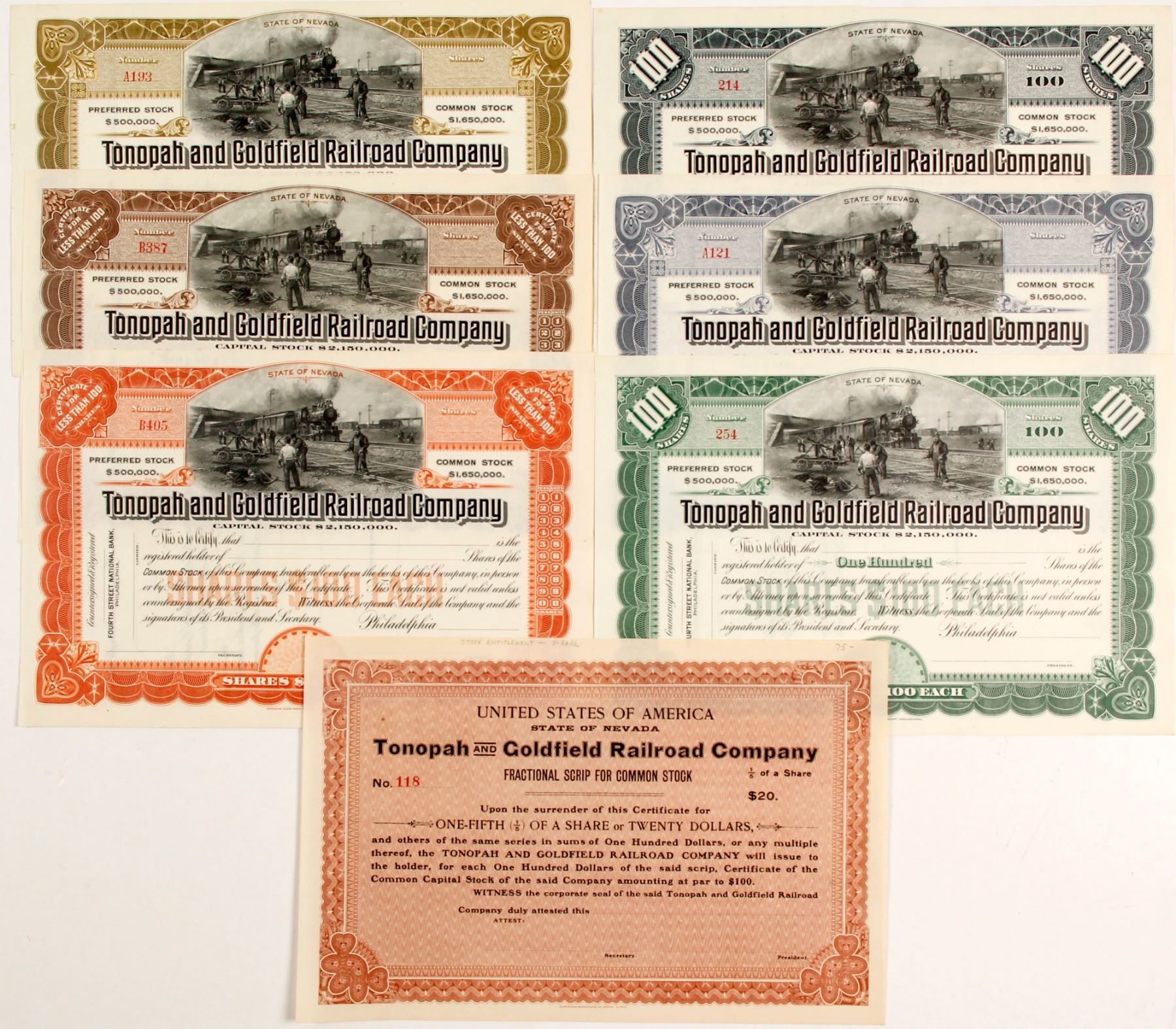 All unissued. #118 fractional scrip for common stock. Stocks-with nice train and depot workers vignette-black, olive, brown, slate, green, orange. "Predecessors of the Tonopah and Goldfield (T&G) Railroad, including the Tonopah Railroad, began operations in 1903. The decade of the 1900s was a period of frenzied railroad-building in southwestern Nevada, with rich silver ore discovered at Tonopah in 1900 and gold-bearing quartz at Goldfield in 1902. In addition, silver. The first predecessor of the Tonopah and Goldfield Railroad, the Tonopah Railroad (built 1903-1904), was a 60-mile-long narrow gauge line from what was then called Sodaville Junction (9 miles south of Mina) to Tonopah. This spur line merged with the Goldfield Railroad in November 1905 to create the Tonopah and Goldfield Railroad, and the merged rail line would continue to do business under this corporate name until ceasing operations in 1947. Investment money poured into the new gold fields, with the merged Tonopah and Goldfield Railroad claiming to have $2,150,000 in equity capital. The T&G began expanding its trackage in 1905 to cover the 31 miles from Tonopah south to Goldfield, and the nine miles north from Sodaville Junction through Sodaville to Mina. The merged railroad also relaid its existing tracks to become a standard gauge road. With the gold and silver mines in full production, the Tonopah and Goldfield soon had competition from the Las Vegas and Tonopah Railroad and the Tonopah and Tidewater Railroad.[2] In addition, the Bullfrog Goldfield Railroad built some right-of-way and leased out its trackage rights to operating railroads. The Tonopah and Goldfield held a brief strategic advantage over its competitors: its northern railhead at Mina was a junction point with the Nevada and California Railroad (N&C), an affiliate line of one of the largest railroads in the West, the Southern Pacific. This made it possible for passengers from the East or West Coasts to travel to the northern end of the Nevada and California spur line by fast Pullman service; the final leg of the journey, from the Southern Pacific main line at Hazen, Nevada over the N&C and T&G to Goldfield, was however very slow." from wikipedia.com. Prag Collection. State: City: Date: HWAC# 84131
