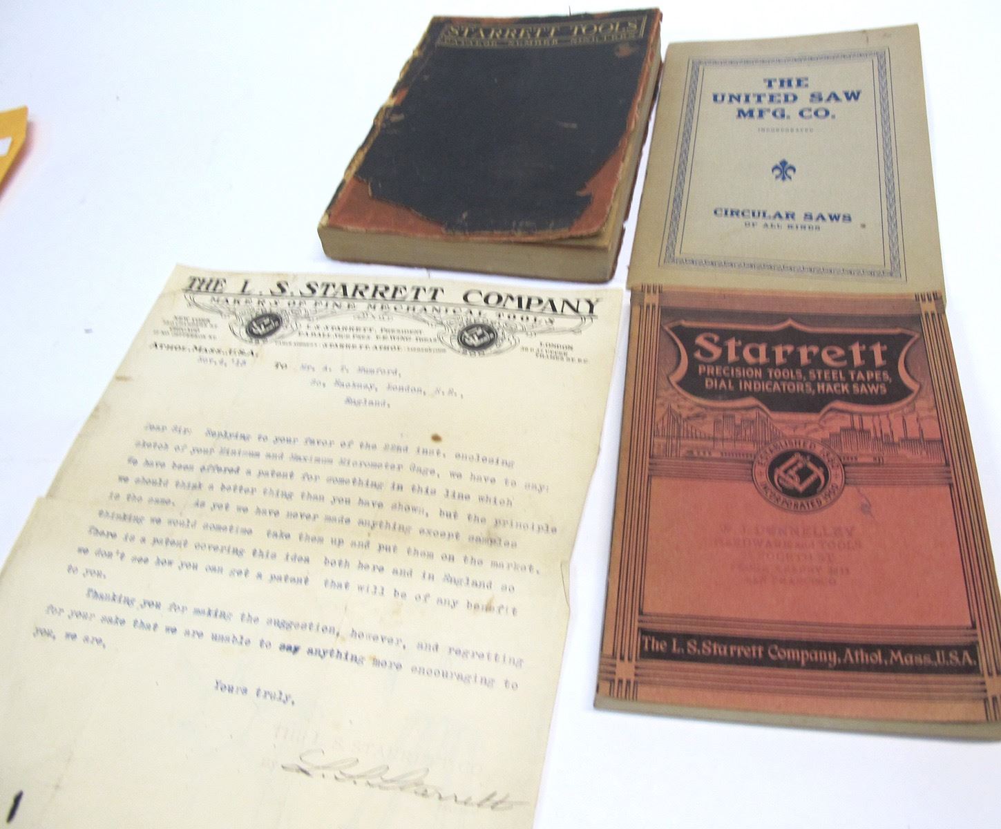 1938 Starrett catalog 282pp, United Saw Mfg. 20pp, Starrett Tools catalog 19 100+pp. Pictorial Starrett letterhead 1913. Date: Location: HWAC# 54937