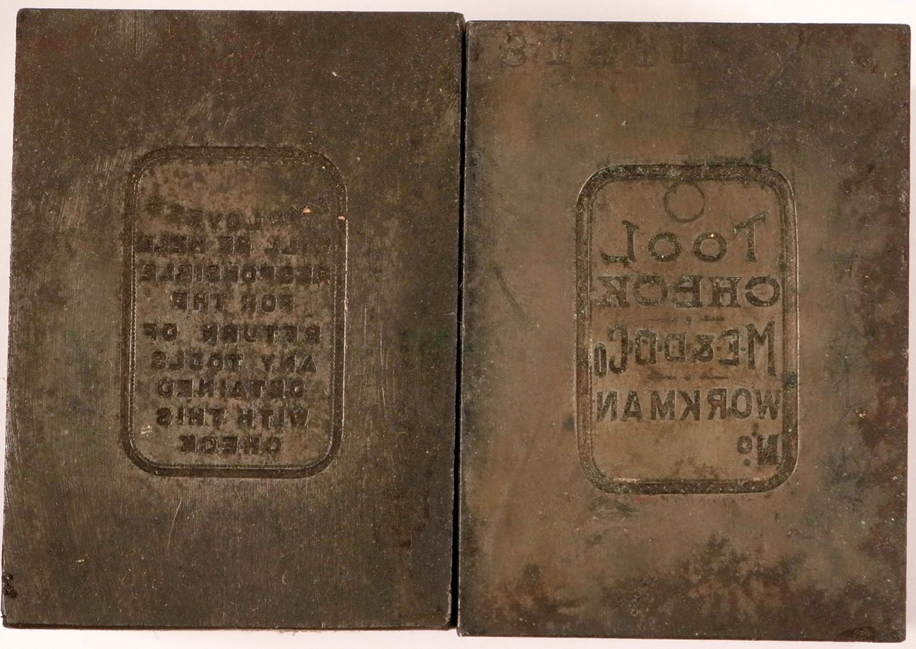 Lot includes two dies. Both dies are 2" x 4". No. 31211 on first dies. Finished product would be 1" by 1.5". Spot for perforation and workman's name/number. Die would print "Tool Check Me & Doc Workman". Northwest Territorial Historical Die. Collection.