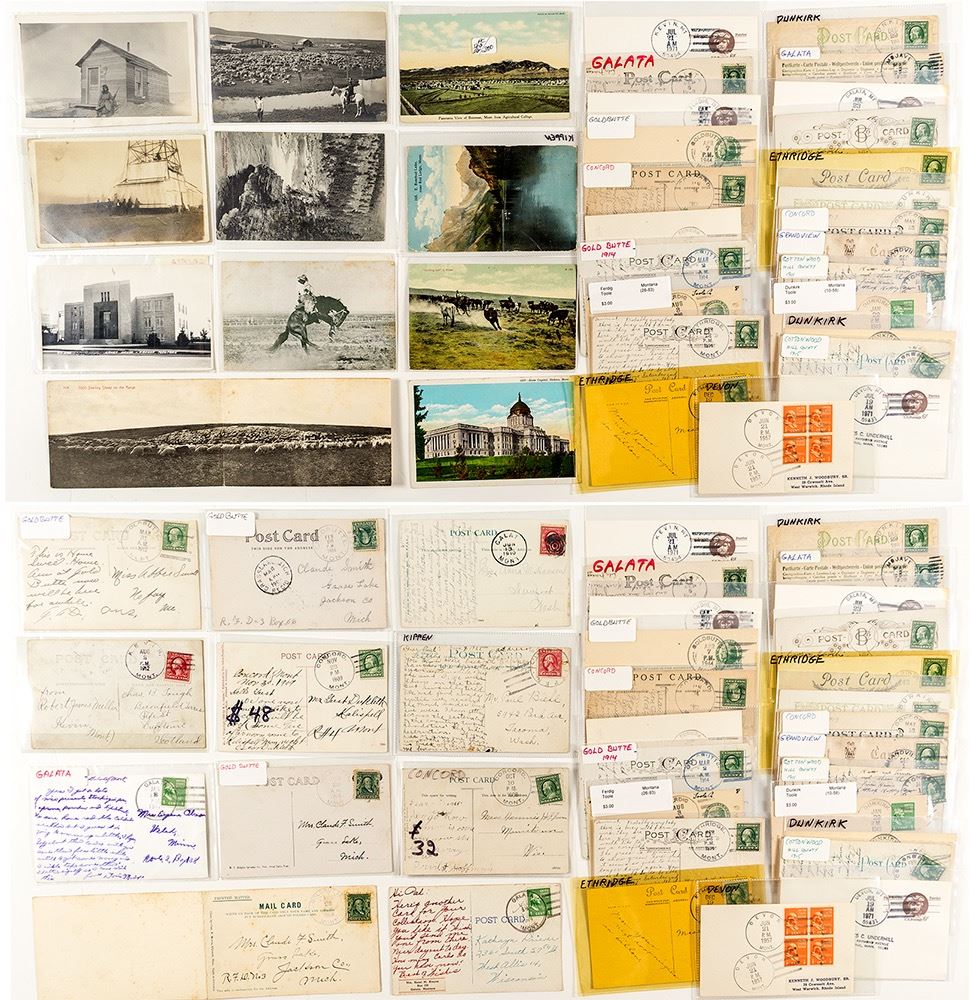 35 total pieces. Six RPC's: sheep ranches near Goldbutte, Goldbutte home being protected by man (G. A. D.) with rifle, bucking bronco, and oil well with workers. Four picture postcards. Postmarks include 1909 Concord, 1910 Dunkirk, 1922 Kippen, 1909 Concord, 1919 Etheridge, 1913 Grandview, 1915 Cottonwood, 1912 Kevin, 1906 Goldbutte, Galata, Ferdig. (Svoboda Collection) City: Toole County State: Montana Date: c1906-1951 HWAC# 35514