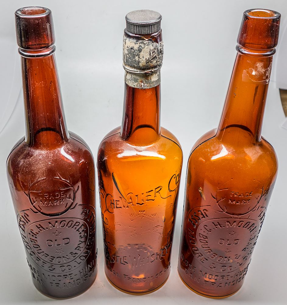 1) Two bottles with picture trade marks: one is old dark amber, the other a lighter strike; Old C. H. Moore Bourbon & Rye, Jesse Moore & Co., Louisville, KY., Jesse Moore-Hunt Co., San Francisco; 2) The Chevalier Co., Old Castle Whiskey, San Francisco, Cal.