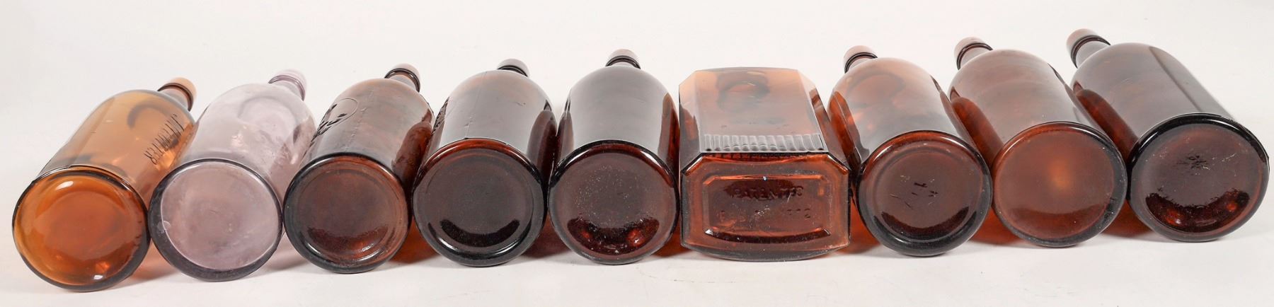 9 tooled top western Whiskies. 4x Jesse Moore, 3x Cutter, amber rectangle and clear Louis Taussig. No apparent chips or cracks.