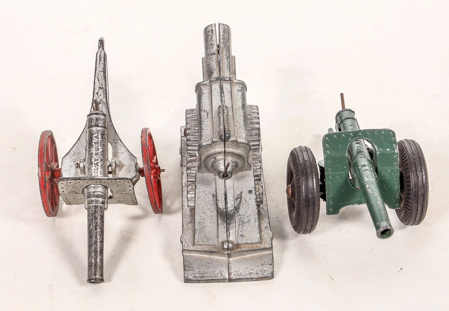 This collection of seven pieces include four pieces of artillery; three artillery pieces are spring loaded to fire small projectiles, one aviation bomb on a cart, one torpedo on a cart, one misc. support US 70. In unrestored condition. Please see photo. All approx. 4”L