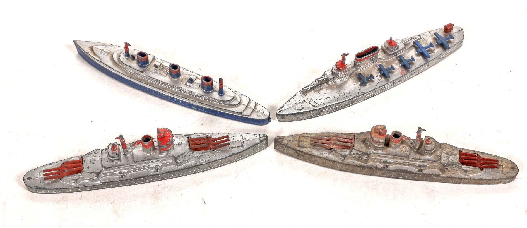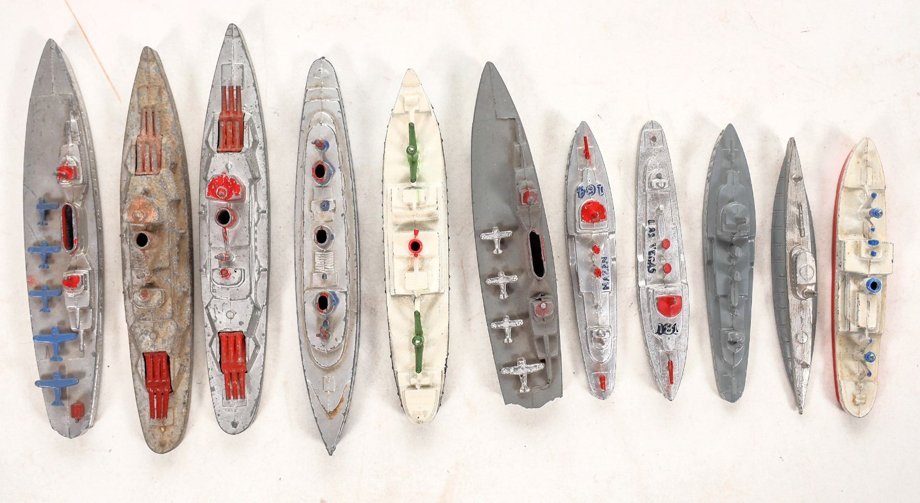 Our Tootsietoy navy includes: a submarine with gray paint; three K 880 Destroyers- one in grey paint, one Hazen 184 with red trim, one Las Vegas 181 with red trim, one troop transport vessel, two heavy battleships, two aircraft carriers, and two tenders. All are unrestored condition. Please see photos. c.1940s. 6”L or less