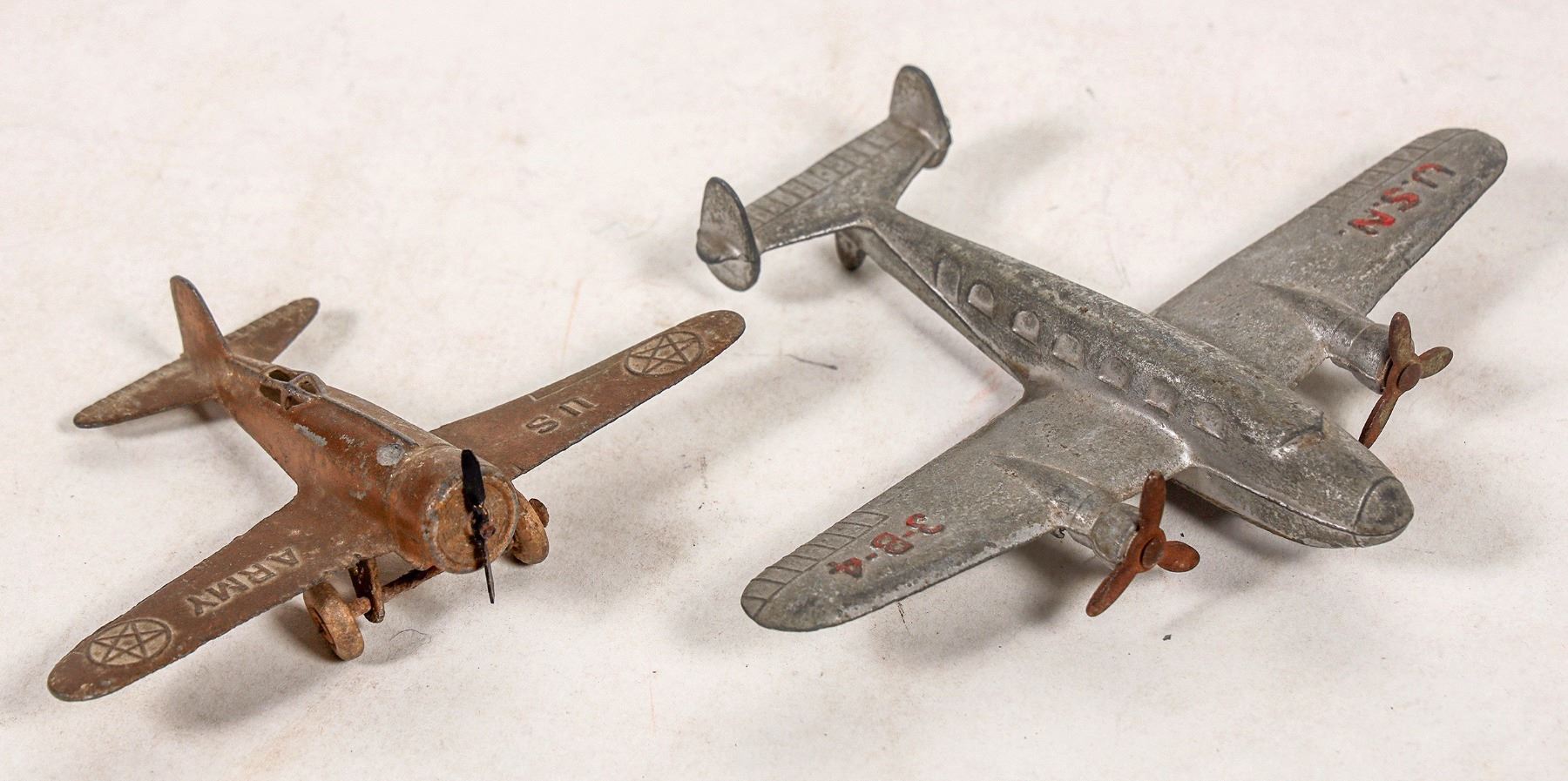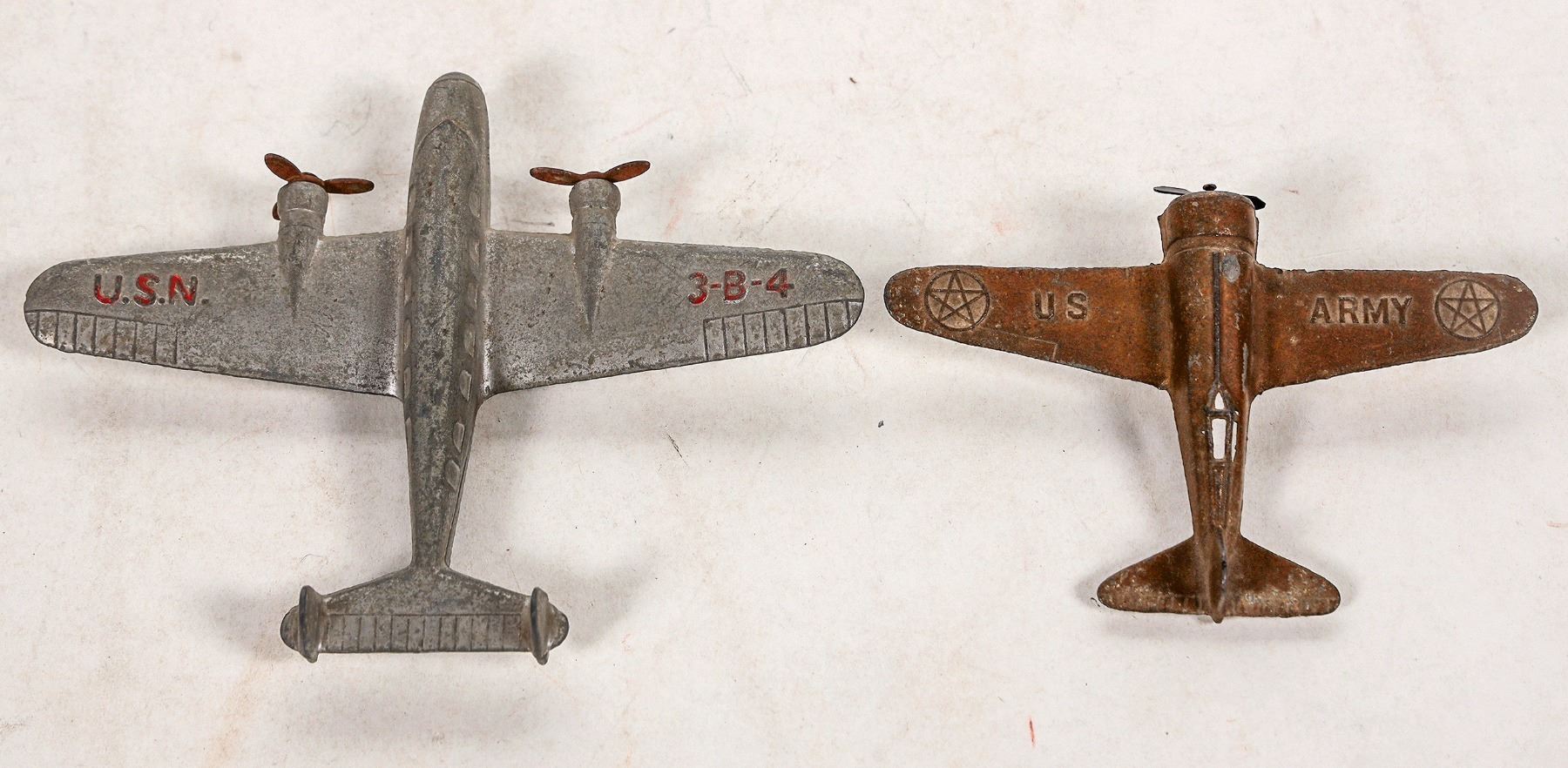 This limited air force has one Army Pursuit fixed-wing aircraft made by Tootsietoy with rubber wheels 4” wingspan. The second plane is a Hubley 82913 marked "USN 3-B-4" with twin tails and spring loaded retractable landing gear. In unrestored condition. Approx 6x4" Please see photo for details.