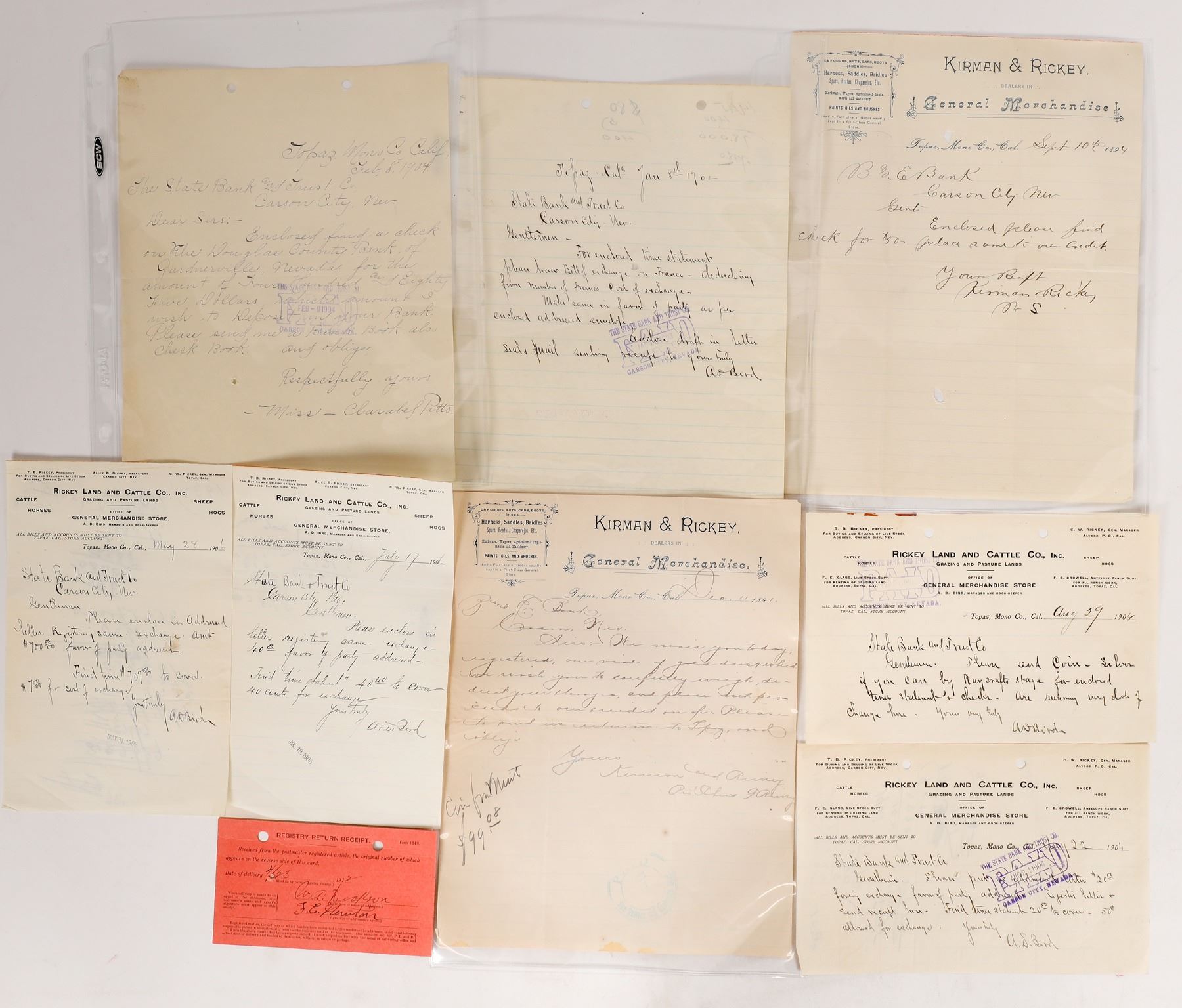 Mono County receipts from The Rickey Land & Cattle Company (4), receipts for Kirman & Rickey General Merchandise (2) and two (2) letters from The State Bank & Trust of Carson City. there's also a return receipt for Farmers Bank of Carson Valley. All in nice condition. Please see photos for more details. Topaz California