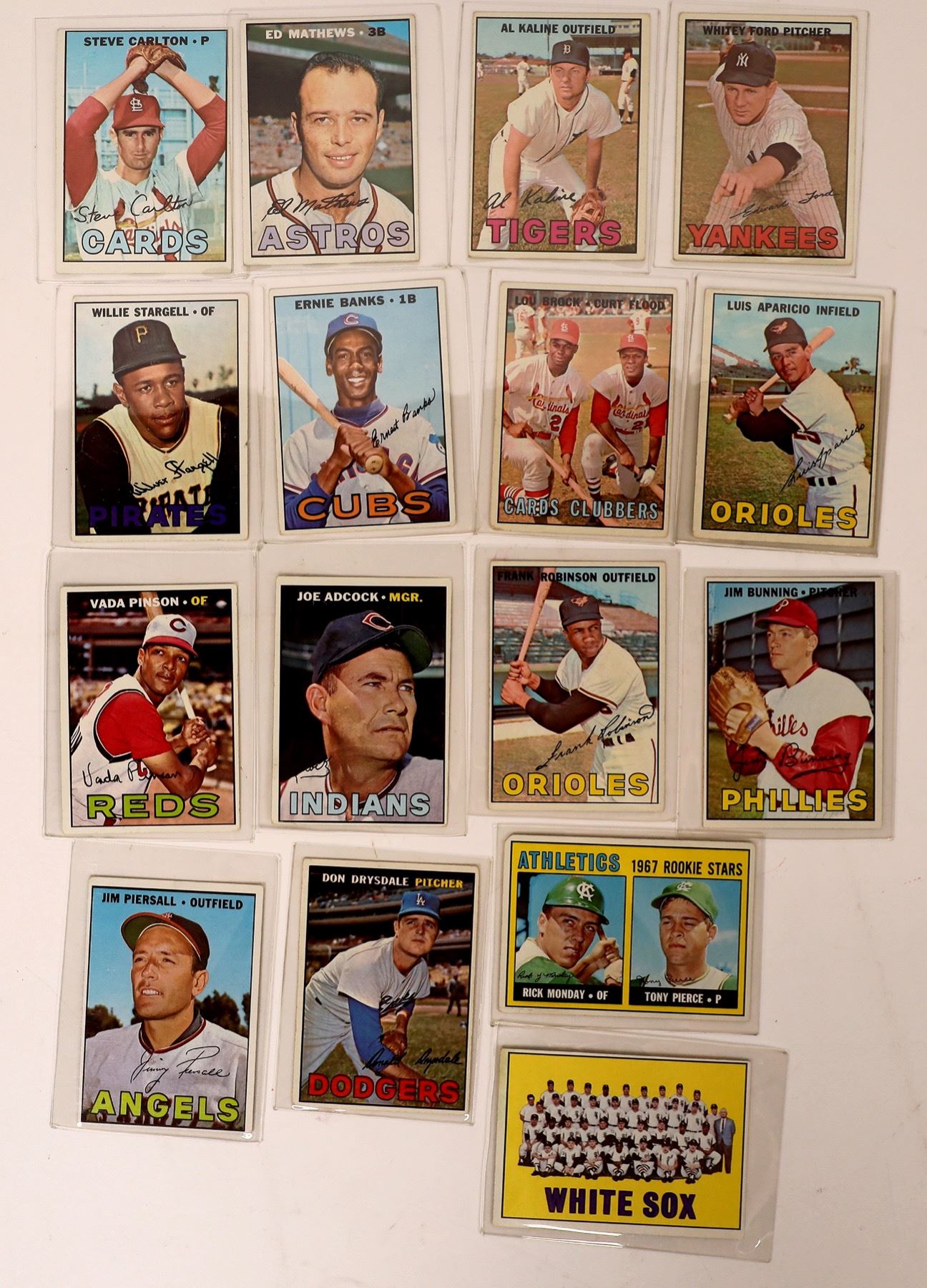 About 275 cards. Includes cards in the 500's like Jim Bunning ($30), Jimmy Piersall ($30), Vada Pinson ($30), White Sox Team ($30), Joe Adcock ($30). Also Frank Robinson, Lis Aparicio, Brook & Flood, Banks, Stargell, Ford, Kaline, Drysdale, Ric Monday rookie, Mathews, Carlton, etc. Duplicates.