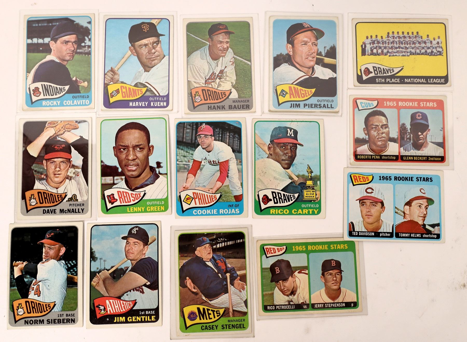 Lot of over 140. Includes Rojas, Gentile, Siebern, Carty rookie all star, Helms rookie, Lenny Green, McNally, Bauer. Joe Torre, Casey Stengal manager, Piersall, Petrocelli rookie, Kuenn, Braves team, Colavito, Beckert rookie.