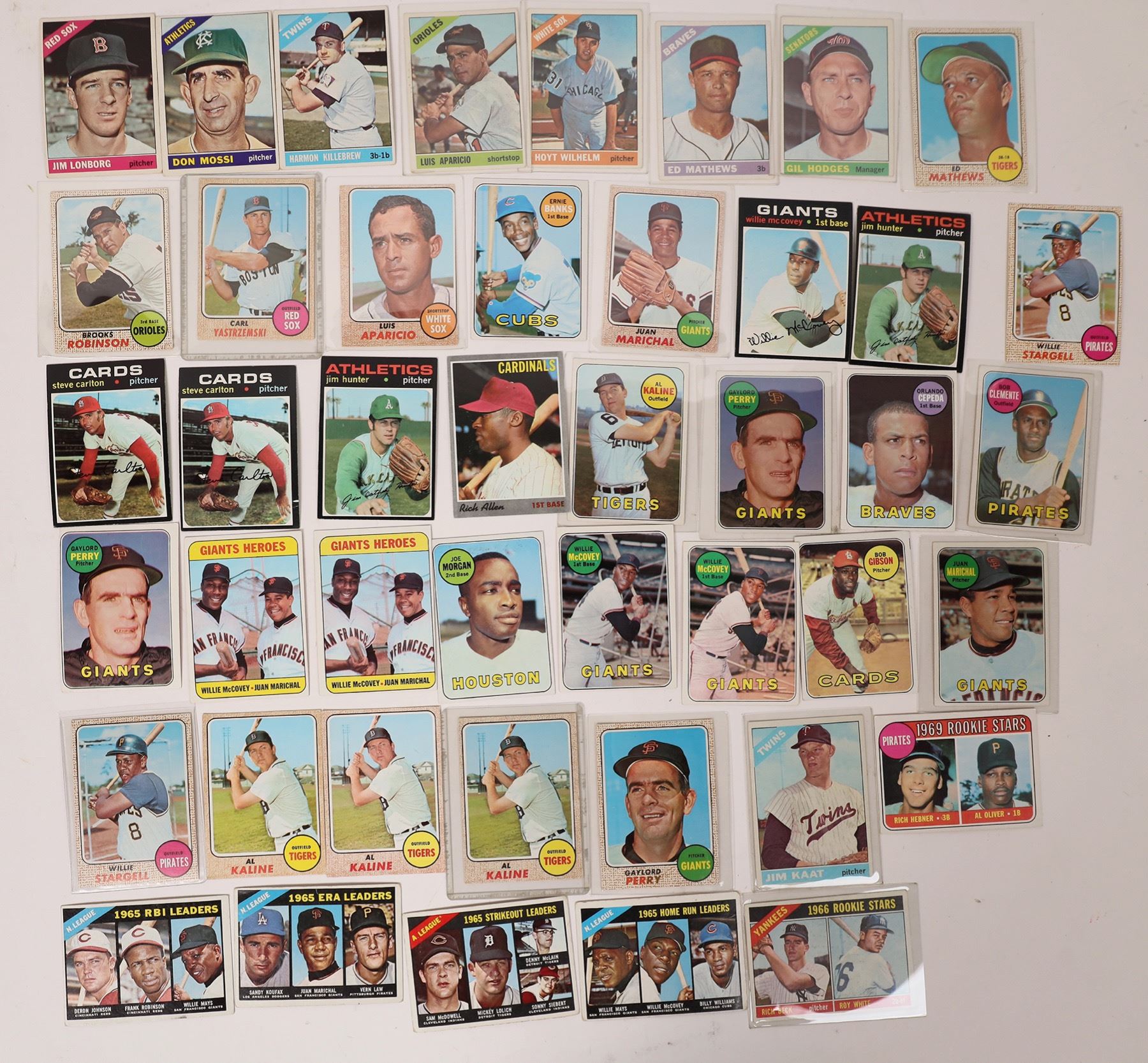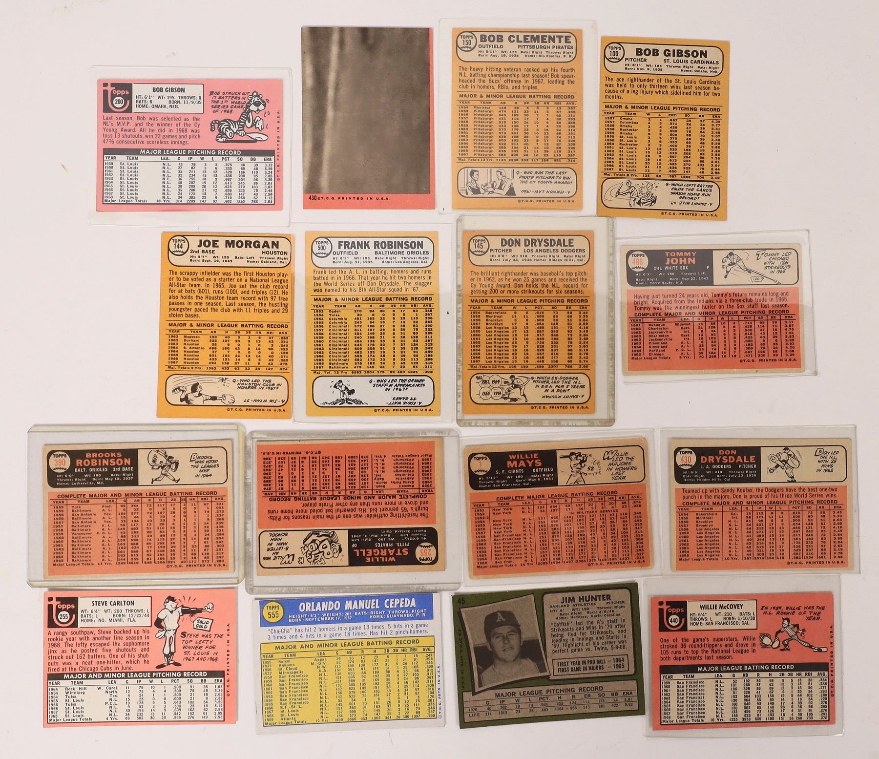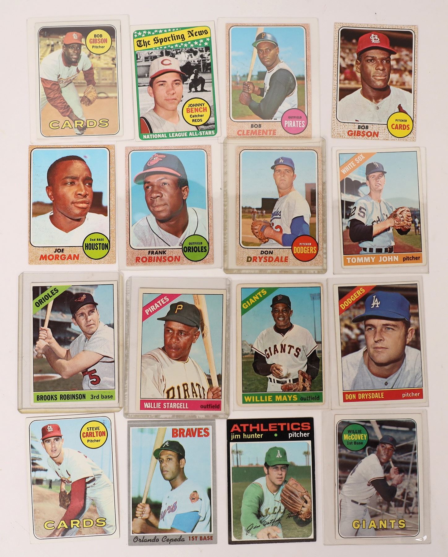 1) 1966. 18 cards. Includes Tommy John, Mays Drysdale, Stargell, Brooks Robinson. 2) 1968. 13 cards. Includes Brooks and Frank Robinson, Drysdale, Gibson, Joe Morgan, Clemente. 3) 1969. 18 Cards. Includes Gibson, McCovey, Carlton, Banks, Bench all star. 4) 1970. 2 Cards. Cepeda and Rich Allen. 5) 1971. 6 cards. Jim Hunter, Dups, but all are major players! Total 55.