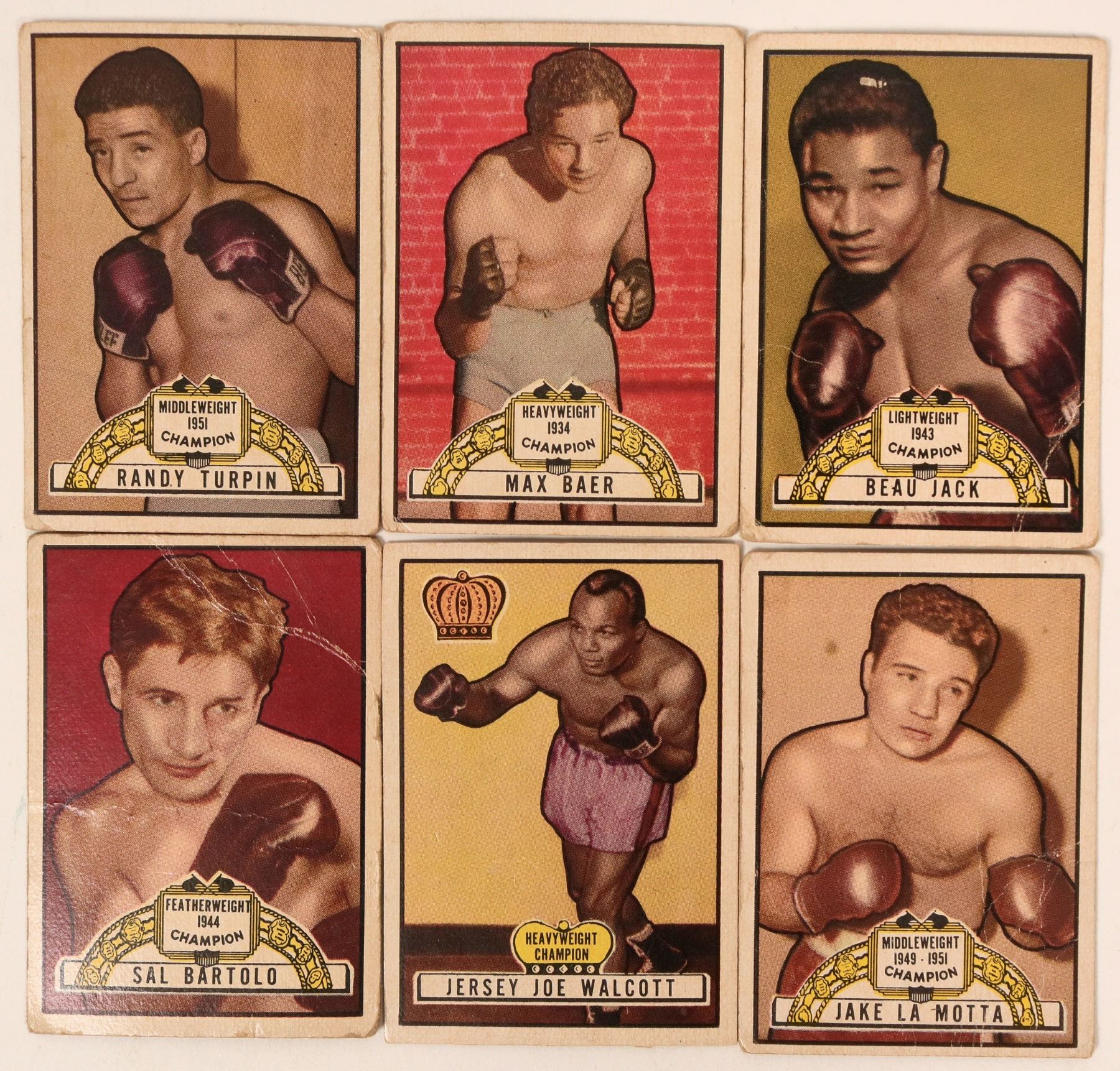 Six of the Topps Boxing cards: #3 Jake LaMotta; #10 Randy Turpin; #11 Max Baer; #22 Beau Jack; #28 Sal Bartola; #31 Jersey Joe Walcott. None are near-mint, but several are perhaps very fine. See photo.