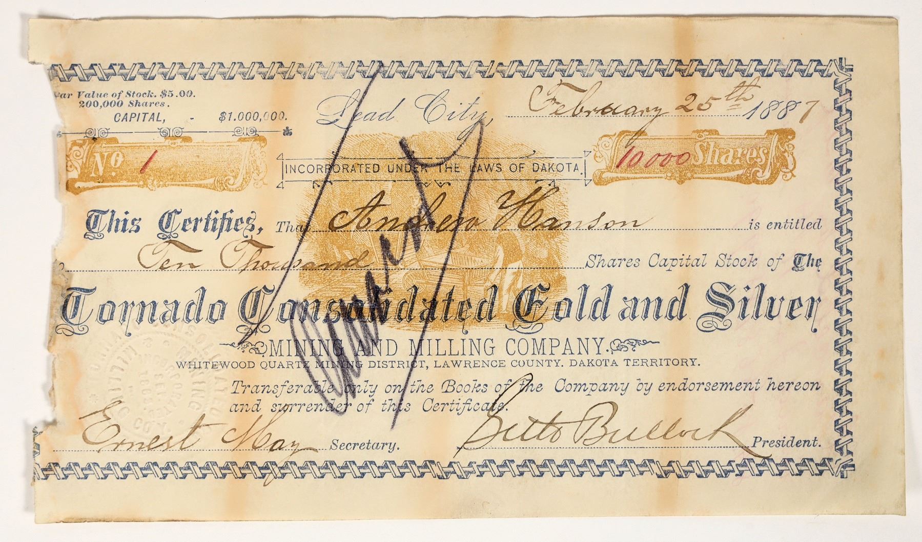Fantastic! The first issued stock for this company, found in the Homestake hoard. Dave Shaddrick notes that this mine encountered a fabulously rich stope that produced 1 million ounces of gold, likely while it was under control by Homestake. Inc. in Dakota. No. 1, issued for 10,000 shares to Andrew Hanson in Lead City, Feb. 25th, 1887. Signed by Seth Bullock as president and Ernest May as secretary. Pencil cancelled, but not through signatures. Very rough left edge, like it was torn out of the book. 4.5 x 7.5" Seth Bullock was the first sheriff of Deadwood and ran a hardware store. He arrived in Deadwood the day before Wild Bill Hickok was shot and killed. Bullock became close friends with Teddy Roosevelt, and later became US Marshal for South Dakota. In a March 17th 1884 article, The Deadwood Pioneer Times reported that the Tornado Consolidated was made up of the Tornado, Silver Fraction, Big Test Fraction, Daisy Fraction, Little Bird, and the Minnie Lode. These mines, about 50 acres, were on the east side of Terry's Peak between the Nevada and Fantail gulches. Extensive developments were reported. Work at the lower levels had found several fissures of high grade ore. A May 1882 article called Andrew Hanson "one of our prospective money kings of Nevada gulch." He appears in numerous 1880s articles about South Dakota mining properties.