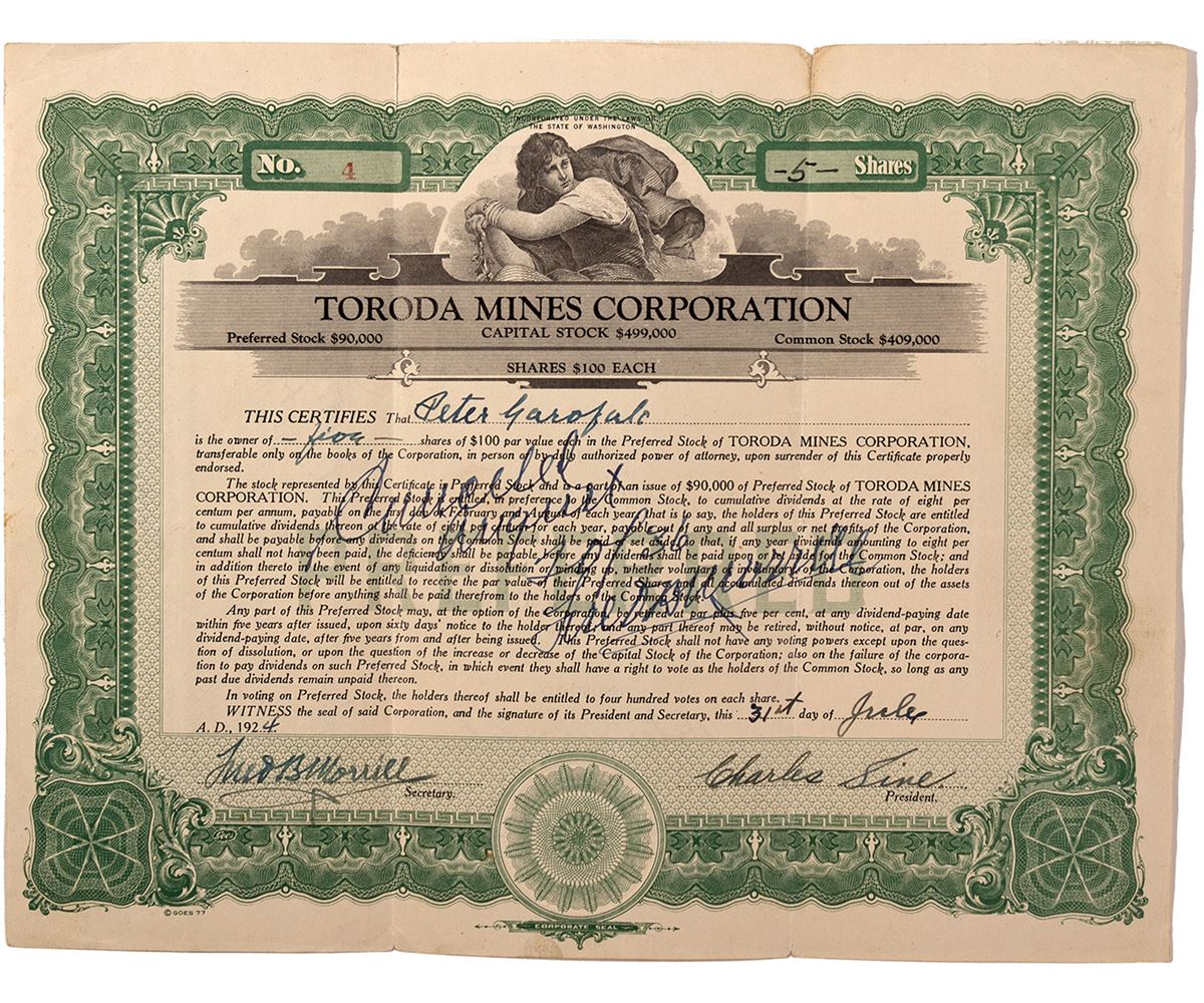 Incorporated in Washington. Cert. #4, issued to Peter Garofalo for 5 shares in 1924. Signed by Charles Sine as president and Fred B. Morrill as secretary. Young mythical male figure vignette. Black print on white with green borders. 12” x 9 ¼”. Pen cancelled. The mining camp of Toroda was located 15 miles north of Republic. The camp had large veins carrying small values on the surface. No specific information on this company. Not listed in the 1924 Mines Handbook or 1931 Mines Register. Goes style certificate. Large tears at the top folds. Good