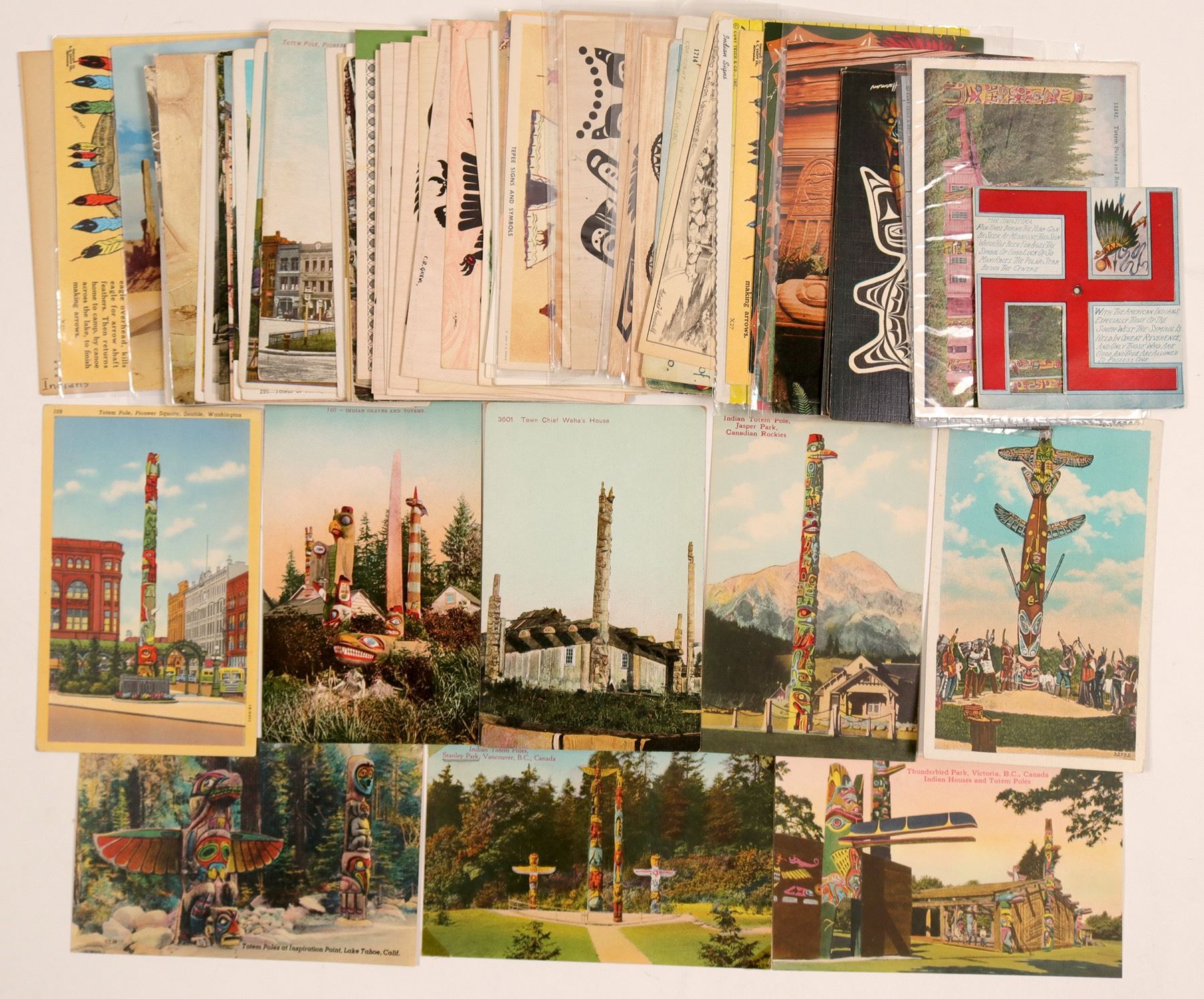 Approximately 100 postcards with some duplicates of totem poles, including comic ones, motifs by Allen James, Indian symbols and their meaning. City: State: Date: