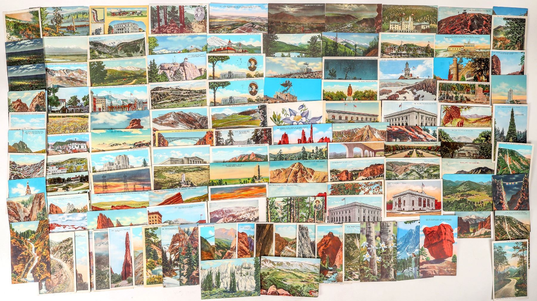 Lot of 120+. Color, borderless and wht. border. Postmarks: Manitou Co., Colo. Sprgs., Denver, Evergreen Co., Greeley ( stamp upside down), K.C. & Denver R.P.O., Pikes Peak , Boulder, Willimantic Conn., Camp Carson. Street Level View : Needle Rock Garden of The Gods, Royal Gorge W/RR tracks, Royal Gorge Suspension Bridge (highest in the world),Balanced and Steamboat Rocks, Pikes Peak Summit House w/cog rail trains, Cog Rail train in snow, Buffalo Bill Grave, Colo. Springs street scene, Churches, Famous hotels lots more. Birdseye view: Manitou Co., Golden Co. by night, Pikes Peak above clouds, road up Pike Peak, Mt. Manitou Incline Railway Colorado 1916-60 Ken Prag Collection