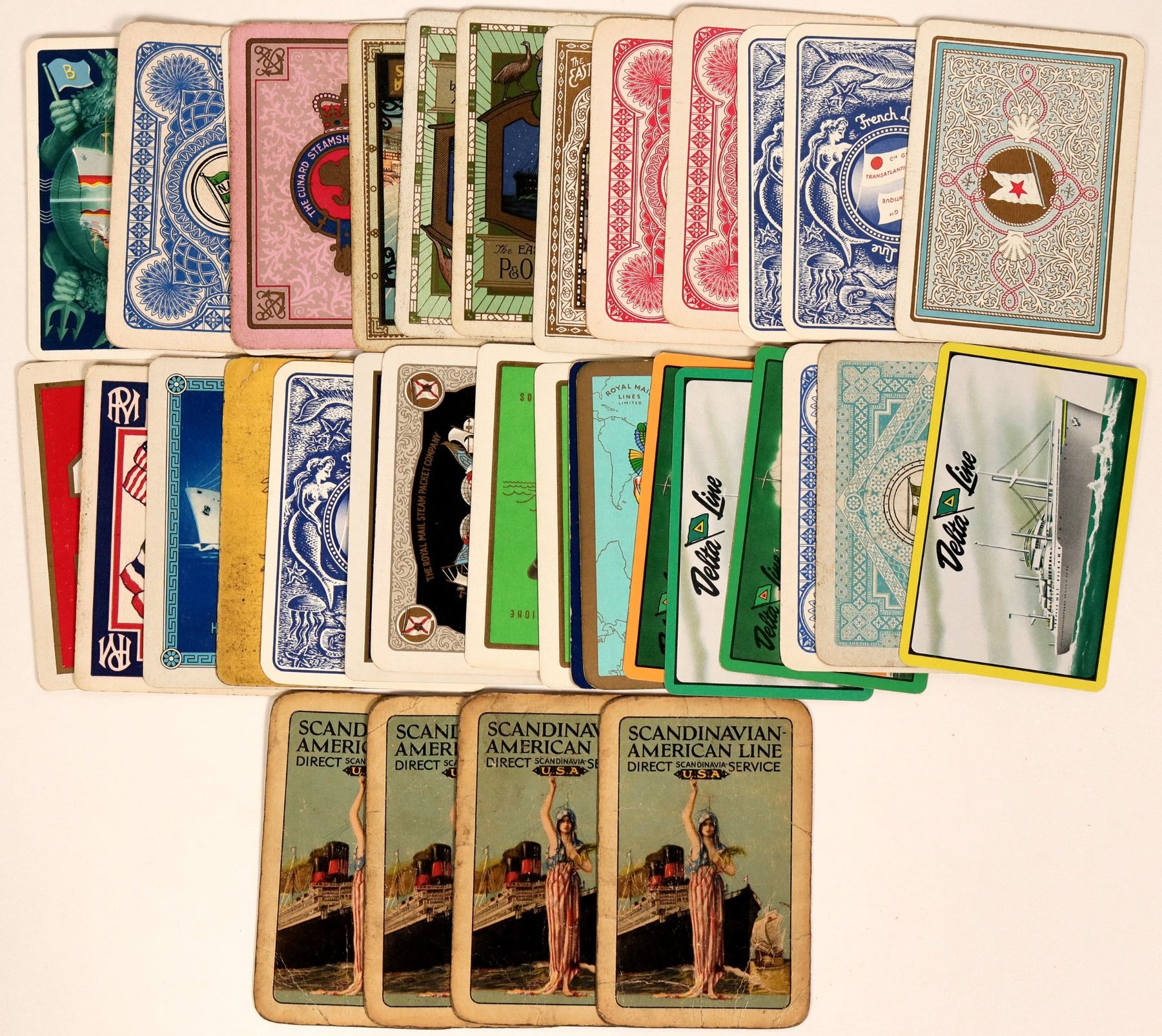 Lot of 33 foreign and domestic tour ship and ship companies advertising playing cards. This collection includes many scarce cards from lines such as: The White Star Line (1845-1934, founded in Liverpool, England, famous for the Titanic); The Alaska Line; Home Lines; Scandinavian American Line (1898-1935); French Line; "Italia" Societa Di Navigazione; United States Lines; Delta Line; N.A.S.M.; The Royal Mail Steam Packet Company; Royal Mail Lines; The Cunard Steamship Company Limited (1879-1934, Lusitania, 1934 merged with White Star Line to form the Cunard-White Star Line); and the P&O and British India Lines; and more. See photo for details.