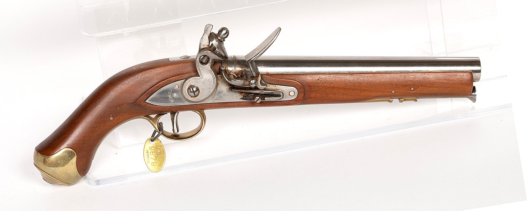 This is a replica flintlock pistol. The lock is marked "Tower, " made in Japan, 9-in barrel. Reproduction. SN: ML-4 1759, JMD Oval Tag: 9679, Condition: Excellent, >