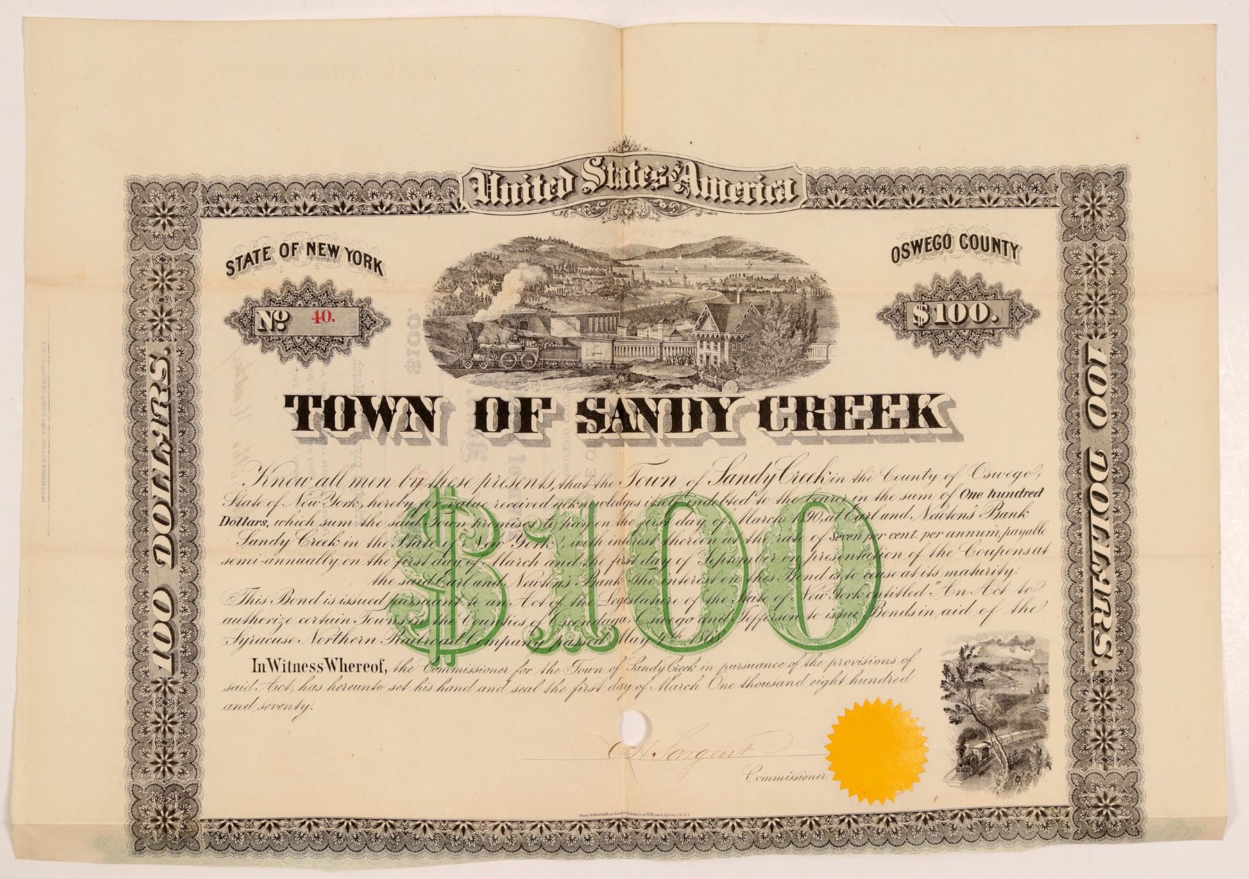 Issued by the State of New York, town of Sandy Creek in aid of the Syracuse Northern Railroad C. .#40, I/C, $100 7% 20 yr bearer bond. Issued March 1, 1870. GREEN, yellow seal, Vignette top 4-4-0 w. cars leaving town of Sandy Creek and bottom left 4-4-0 rounding curve. $100 green underprint. Henry Seibert & Bros printer. Vf Ken Prag Collection