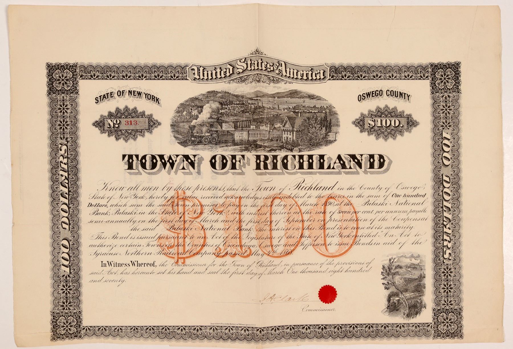 sued by the State of New York, town of Sandy Creek in aid of the Syracuse Northern Railroad Co. .#313, I/C, $100 7% 20 yr bearer bond. Issued March 1, 1870. GREEN, yellow seal, Vignette top 4-4-0 w. cars leaving town of Sandy Creek and bottom left 4-4-0 rounding curve. $100 green underprint. Henry Seibert & Bros printer. Vf Ken Prag Collection