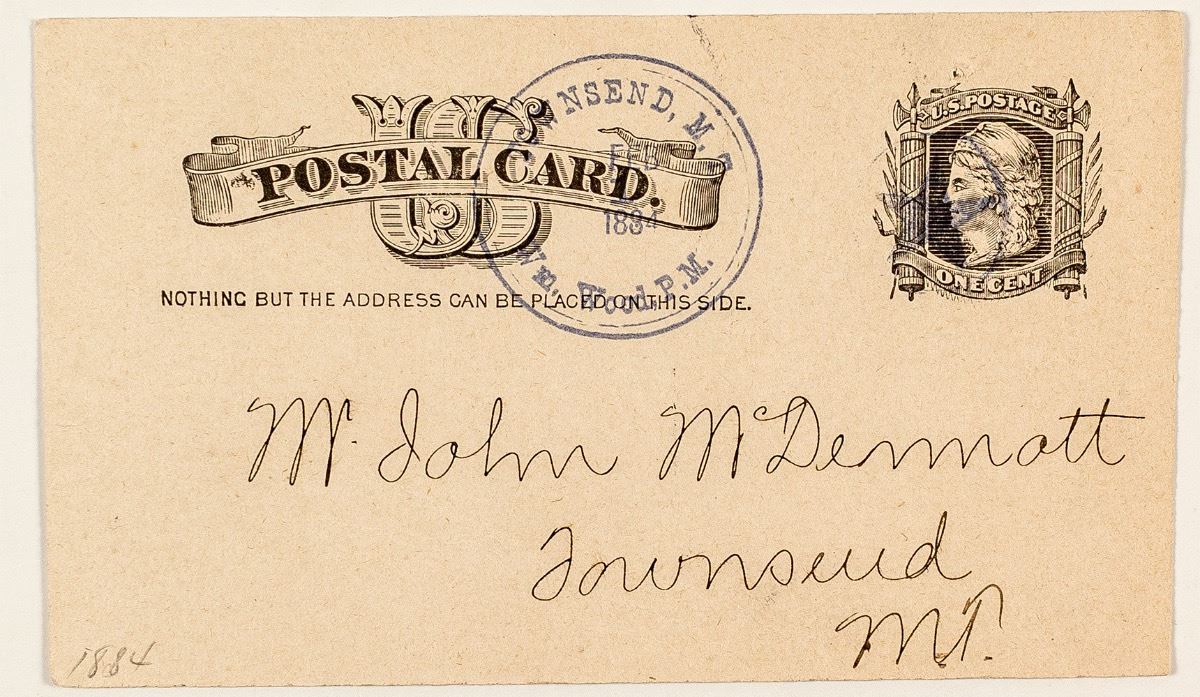 Post office was opened in 1883 and this is an 1884 cancel. Double Ring, blue cancel. Star in circle killer. Wm Wood Post Master. (Svoboda Collection) City: Townsend State: Montana Date: 1884 HWAC# 35245