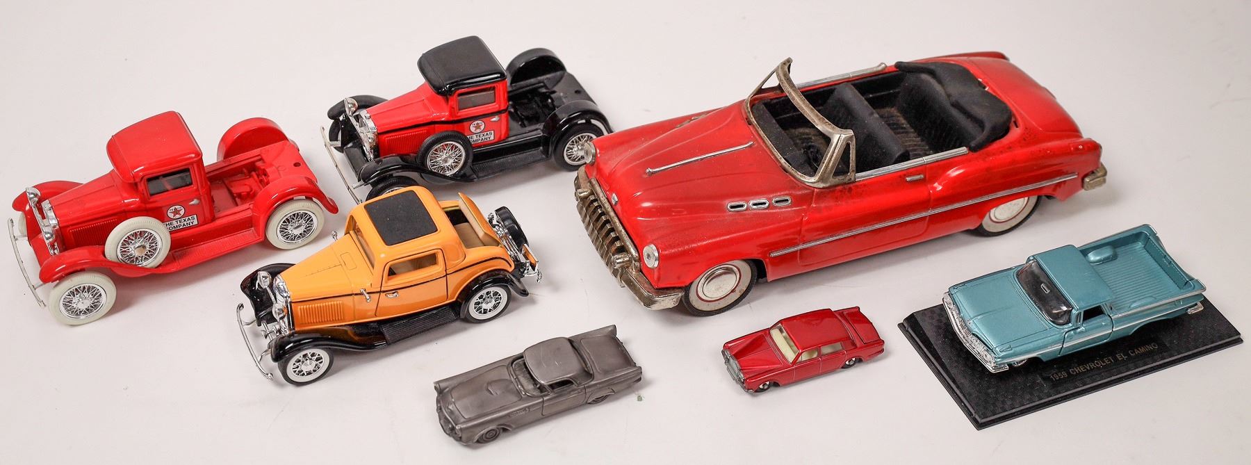7 toy cars, modern. 1955 Thunderbird, 1953? Buick, 1959 El Camino, Rolls Royce Silver Shadow, 1932? Ford, 2x Texaco tractors.