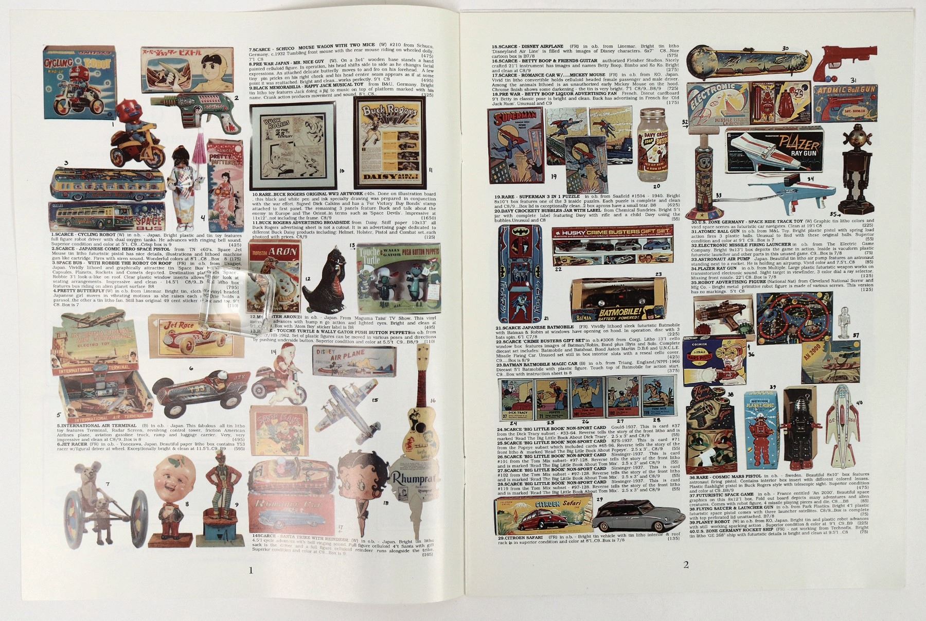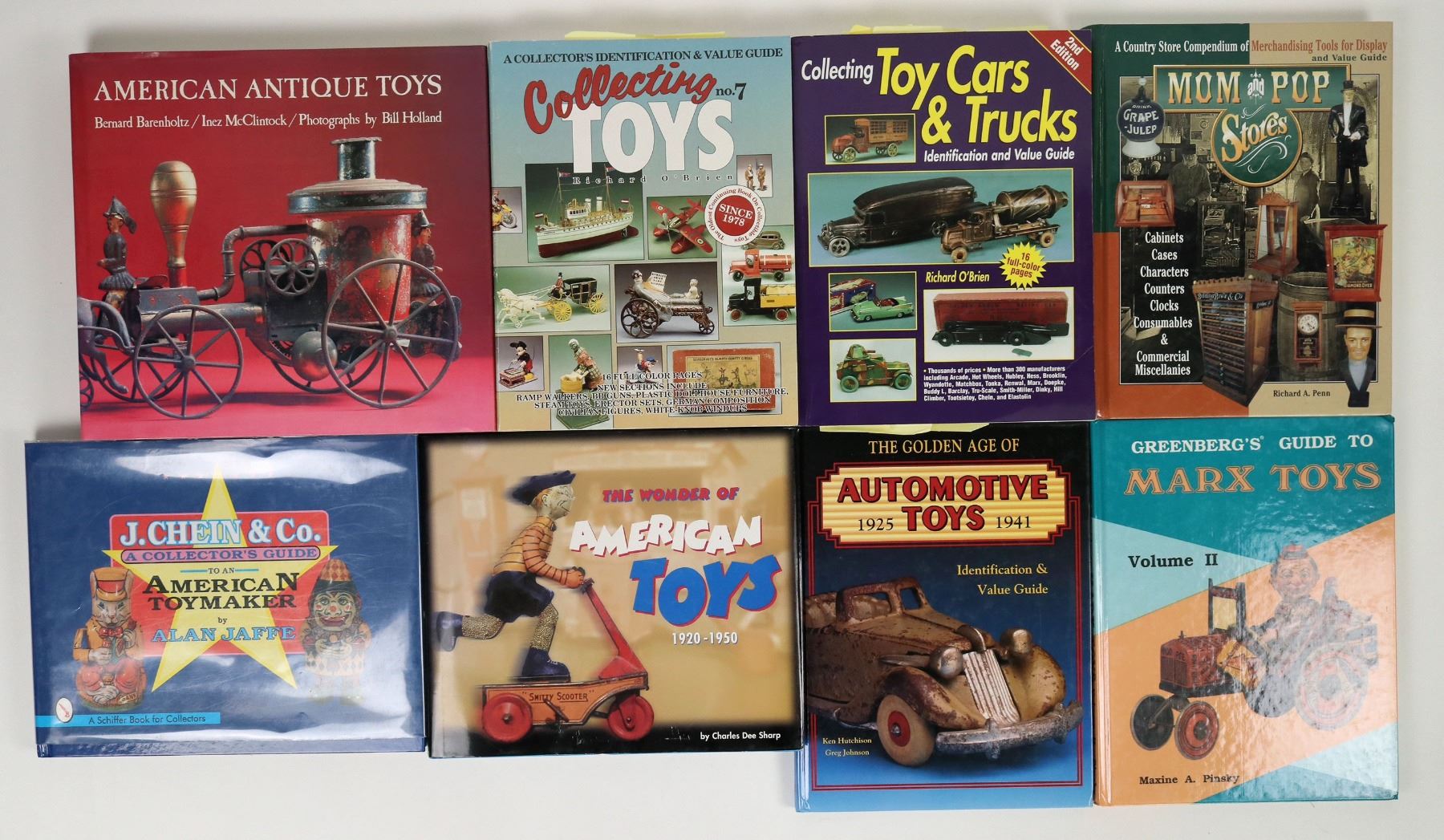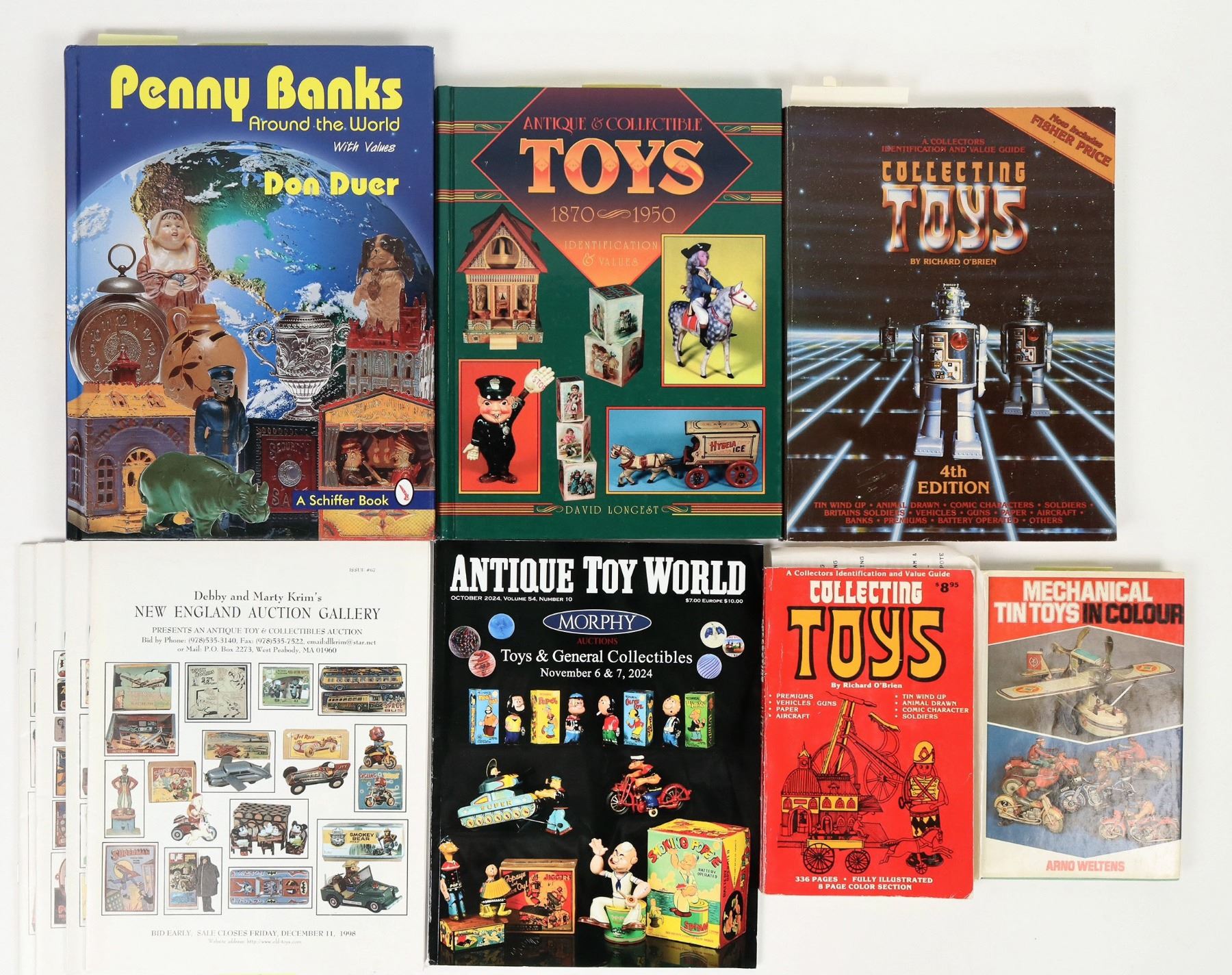 18 toy collecting book and publications. Penny banks, cars and trucks, Marx and various toys, tin toys, late 1900's auction catalogs etc. About 37 lbs.