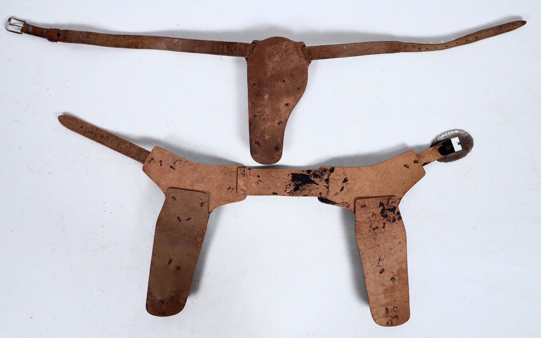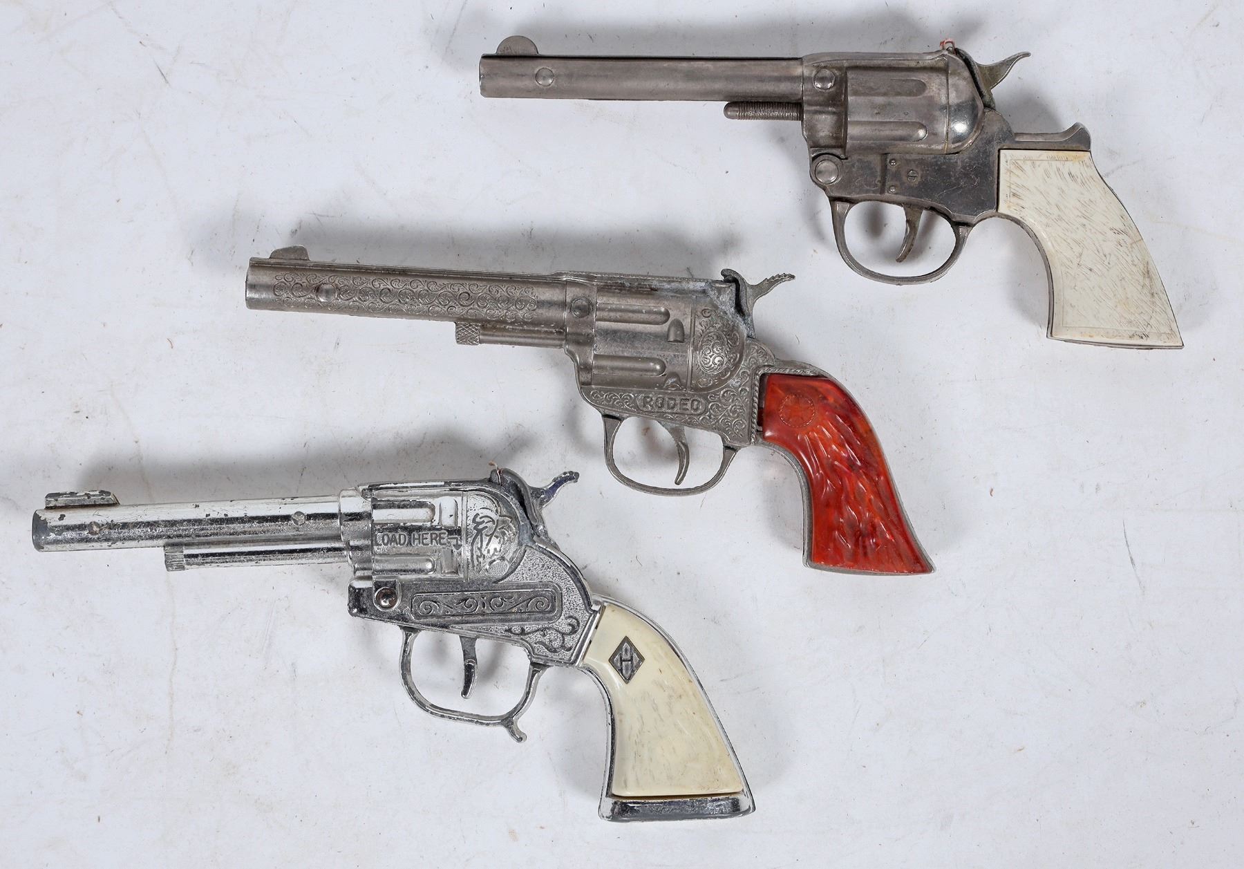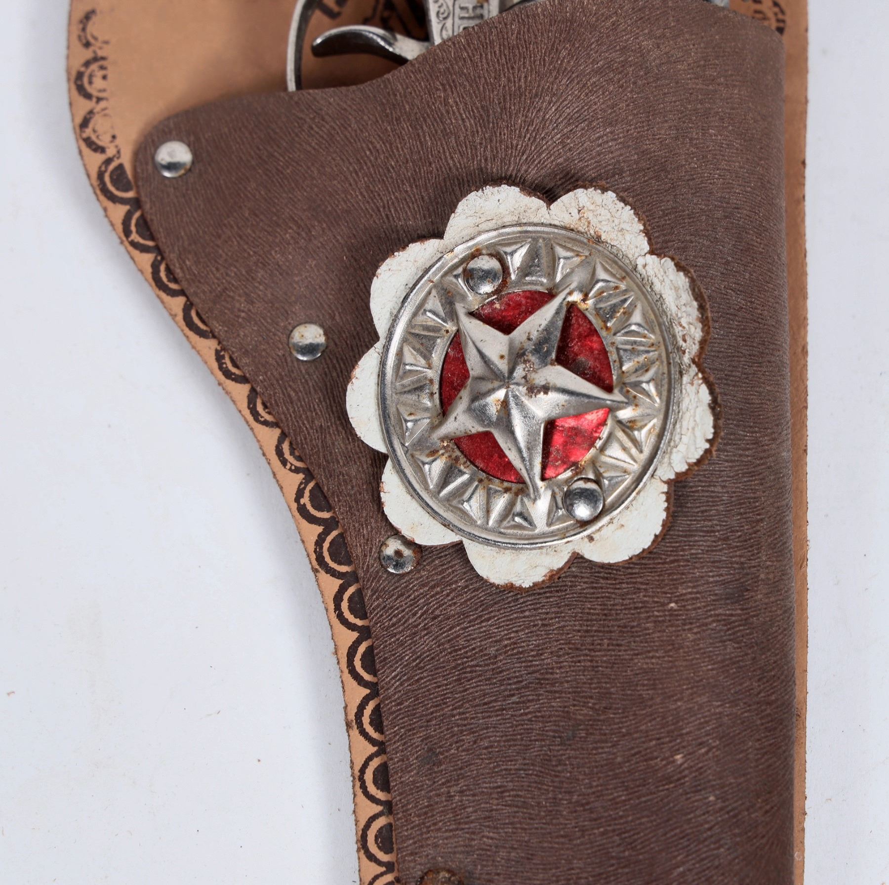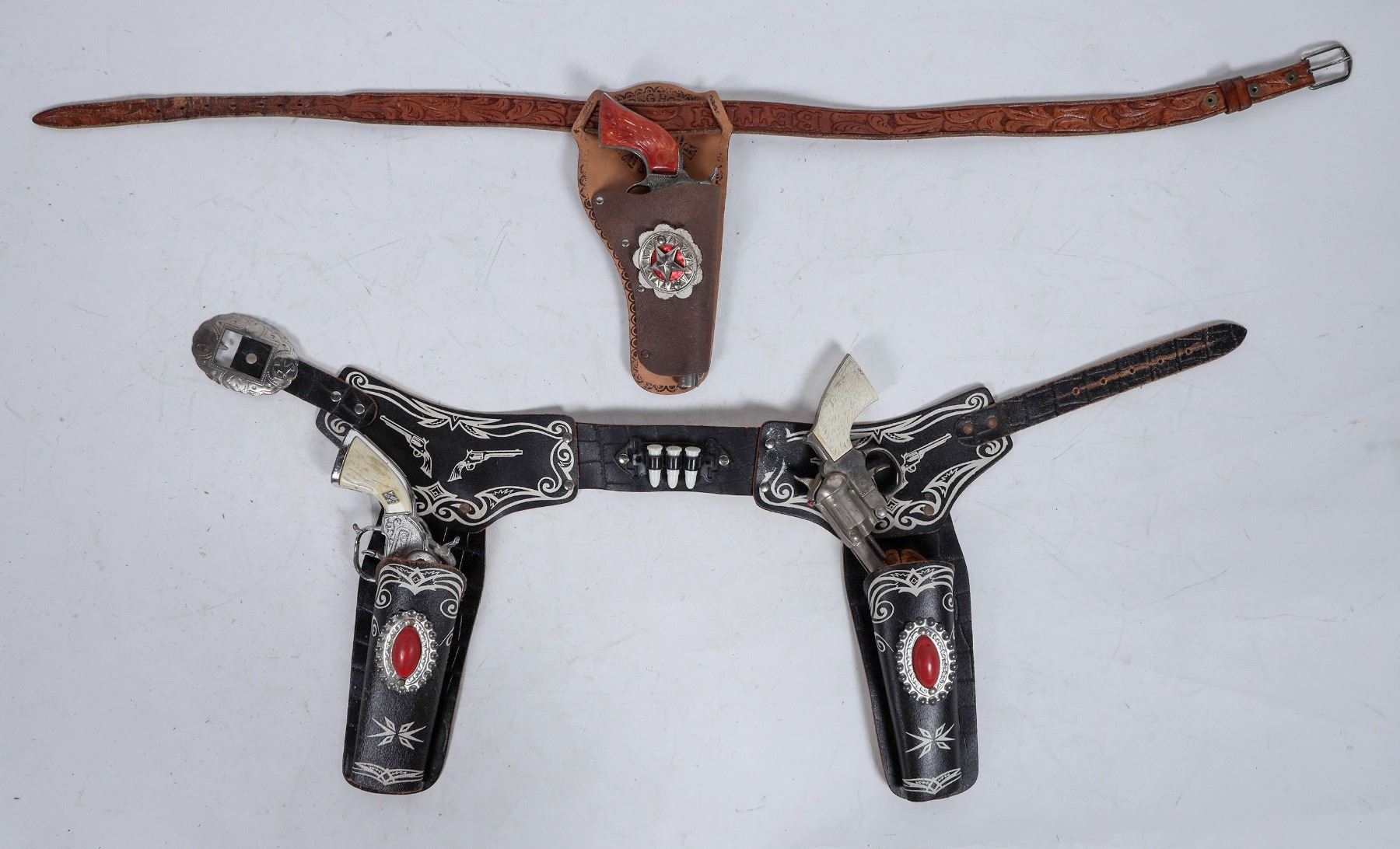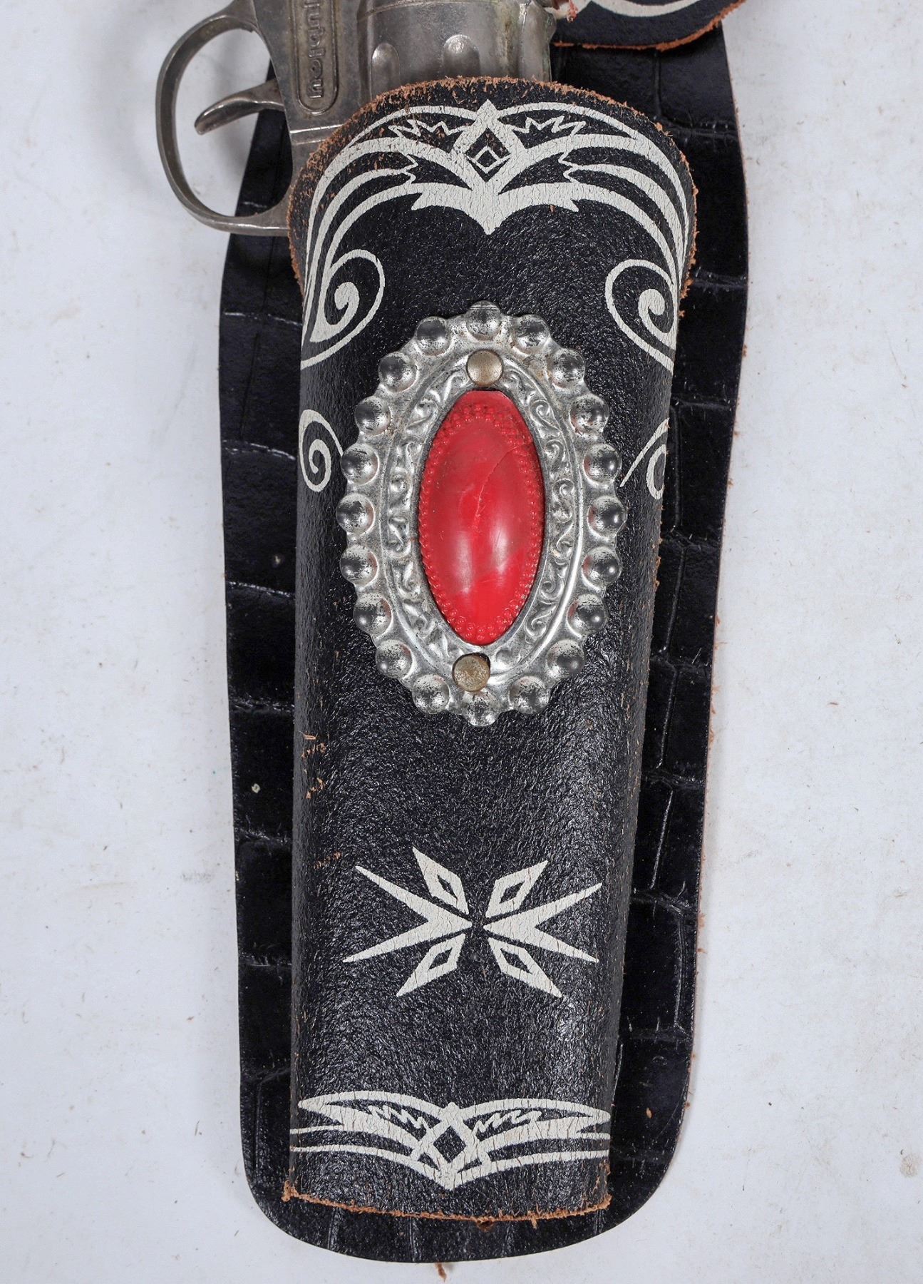 An attractive toy gun set, black painted leather with ruby red conchos (faux ruby), and western designs. One pistol has the "H" for Hubley on the handle, the other is plain and unmarked, though at first glance looks similar.