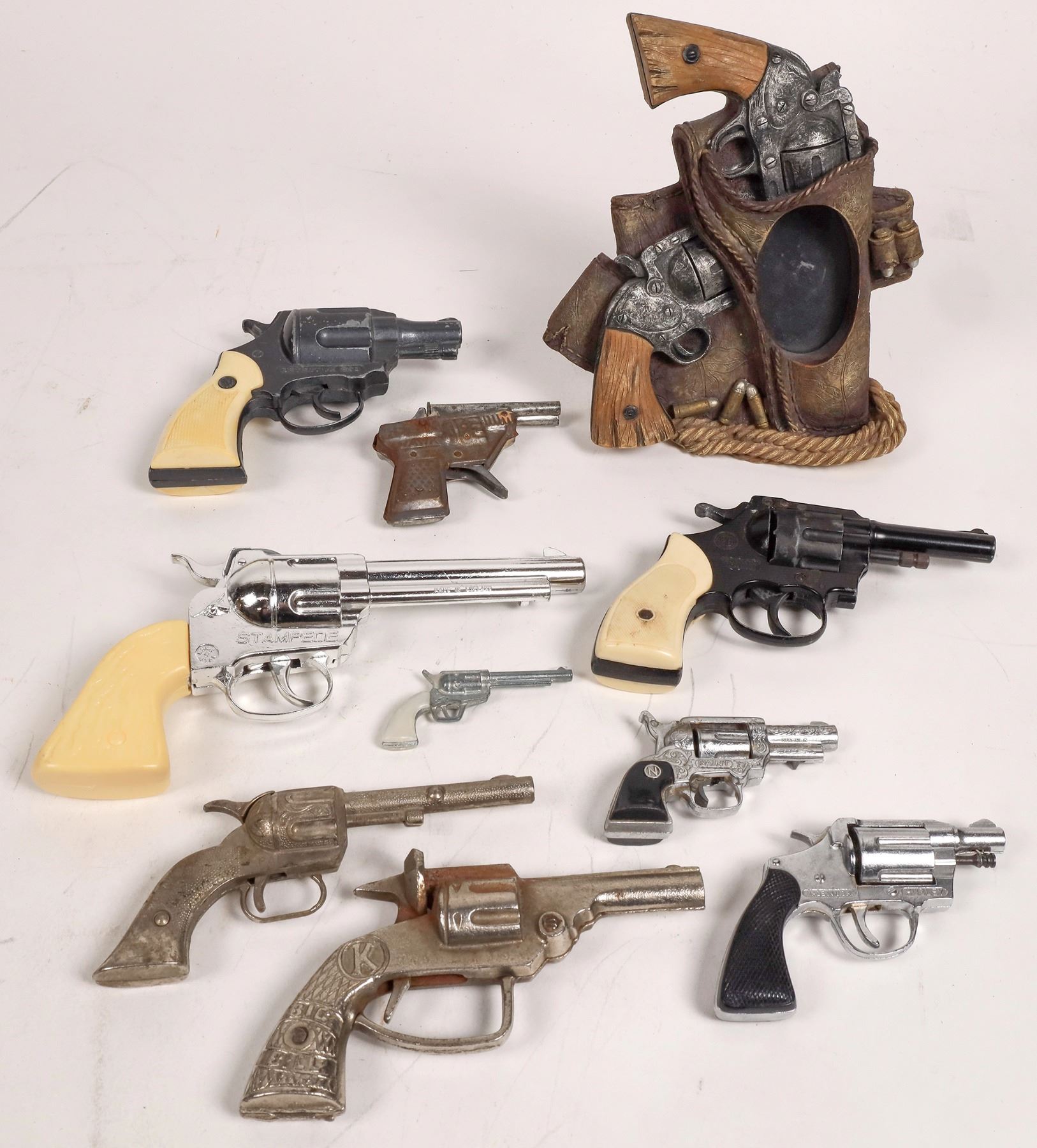 Relive the days of yesteryear when out of the past rides the Lone Ranger. Live it again with this lot of toy guns. There is a Colt Infringement made by Hubley snubnose, c. 1960's; a Nichols Toy Co. Paint model revolver with a swing-out cylinder; Colt SAA with pearl grips about 2 in.; Mondial model 99x snubnose revolver with white plastic grips at 6 in.; Nichols Detective 250 cap snub-nosed; pistol 5.5 in; K brand "big Bill" cap pistol 5.5 in. with large cap surface; Stampede cap pistol revolver with swing up cap compartment 8 in.; Hawk cap pistol made of stamped steel 3.75 in.; Hubley PAL cap pistol 5.75 in.; two pistol oval photo frame at 8 in. Please see photos for details.