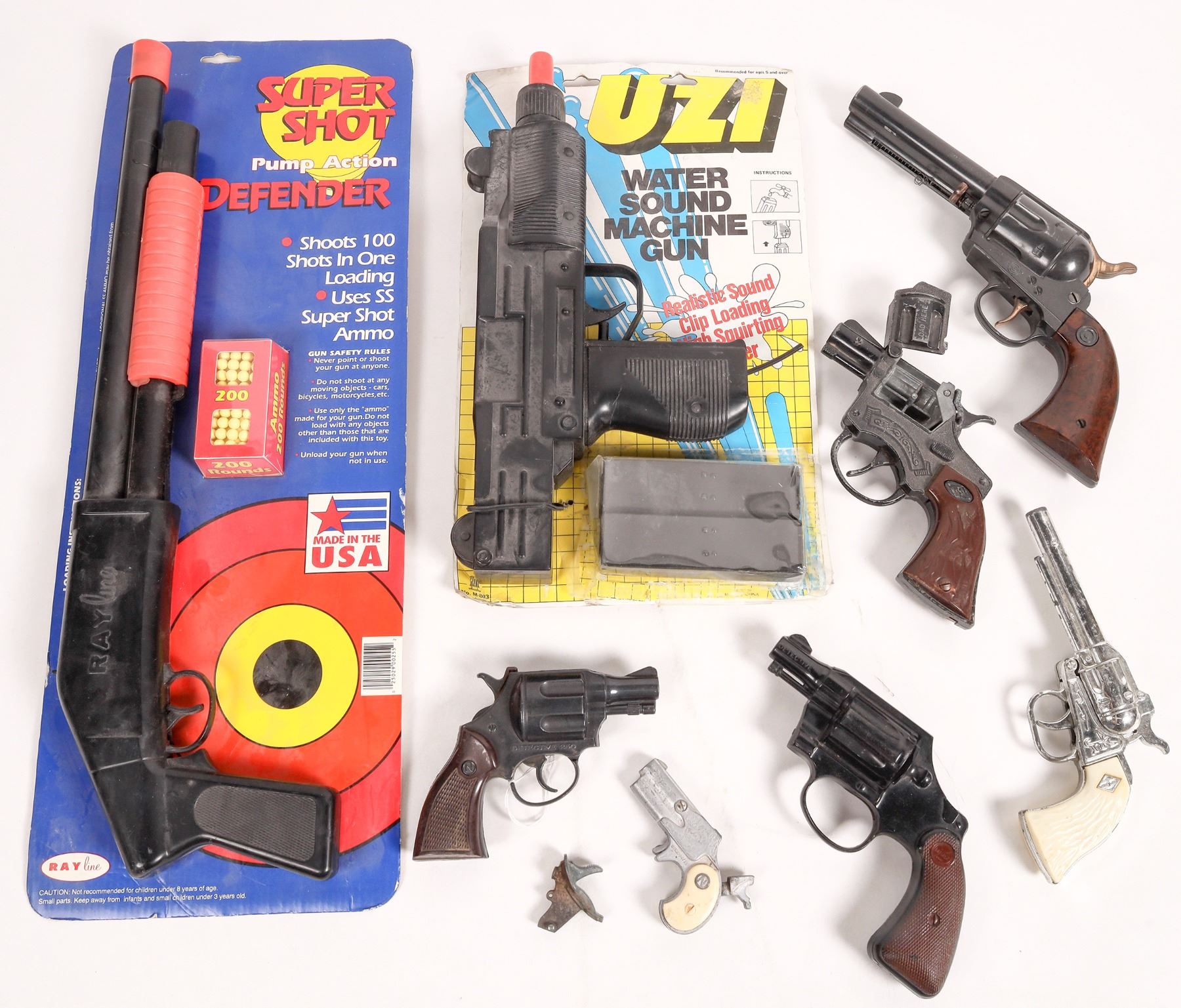 This is a collection of toy guns with three detective specials, a water Uzi squirt gun, a Super Shot Defender still on the card backing with 110 rounds of plastic bbs. A revolver with a five inch barrel; derringer.